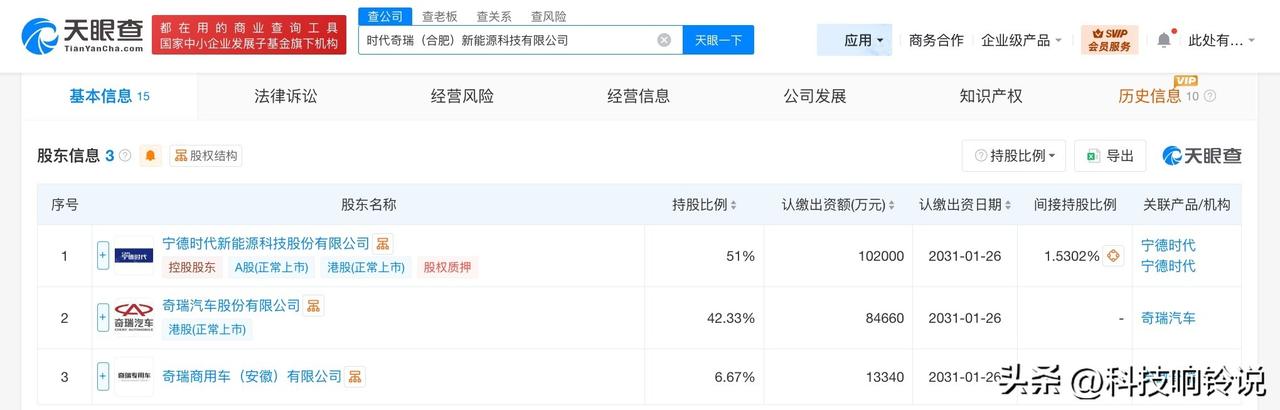 【宁德时代、奇瑞汽车合资成立新能源科技公司 注册资本20亿】 天眼查App显示,近日,时代奇瑞(合肥)新能源科技有限公司成立,法定代表人为来永杰,注册资本20亿人民币,经营范围为电池制造,电池零配件生产,电池销售,电池零配件销售,储能技术服务,技术服务、技术开发、技术咨询、技术交流、技术转让、技术推广,货物进出口。股东信息显示,该公司由宁德时代(300750)、奇瑞汽车股份有限公司、奇瑞商用车(安徽)有限公司共同持股。 天眼查信息: