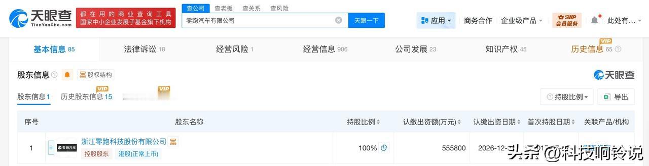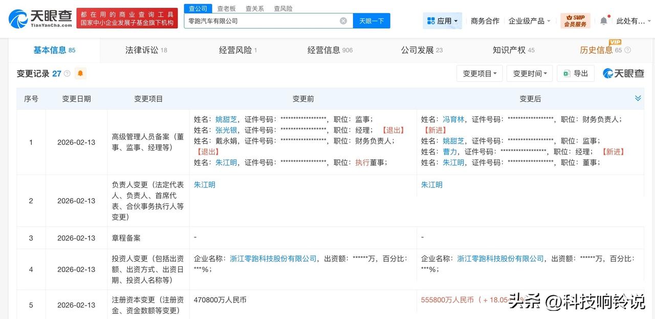 【零跑汽车公司增资至55.58亿 朱江明由执行董事改任董事】 天眼查App显示,近日,零跑汽车有限公司发生工商变更,注册资本由47.08亿人民币增至55.58亿人民币,增幅约18%,朱江明由执行董事改任董事,同时,多位高管发生变更。 零跑汽车有限公司成立于2017年1月,法定代表人为朱江明,经营范围含新能源汽车整车销售、汽车零配件零售、汽车零配件批发、新能源汽车电附件销售、计算机软硬件及辅助设备零售、通讯设备销售、信息技术咨询服务等。股东信息显示,该公司由浙江零跑科技股份有限公司全资持股。 天眼查信息:
