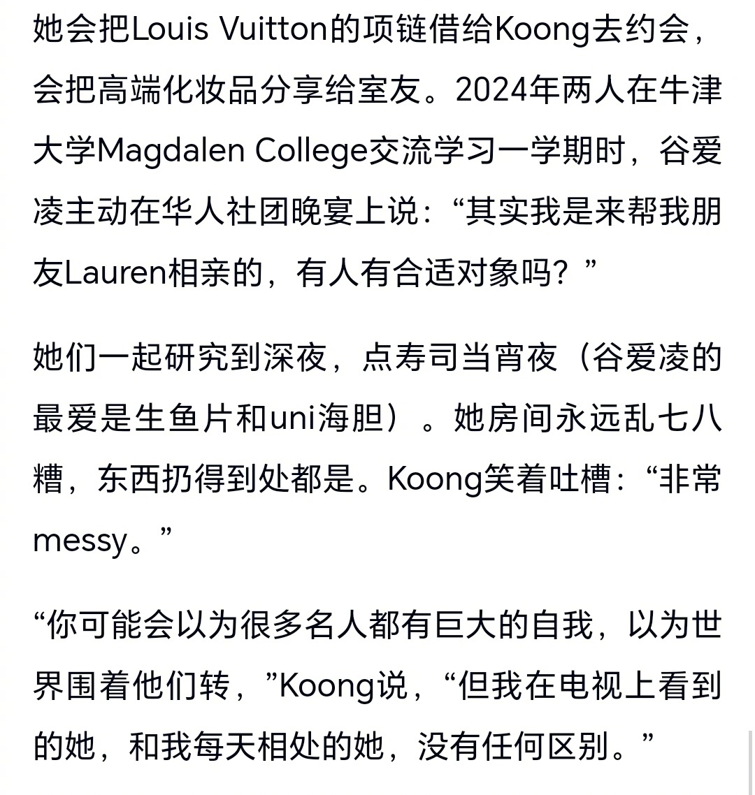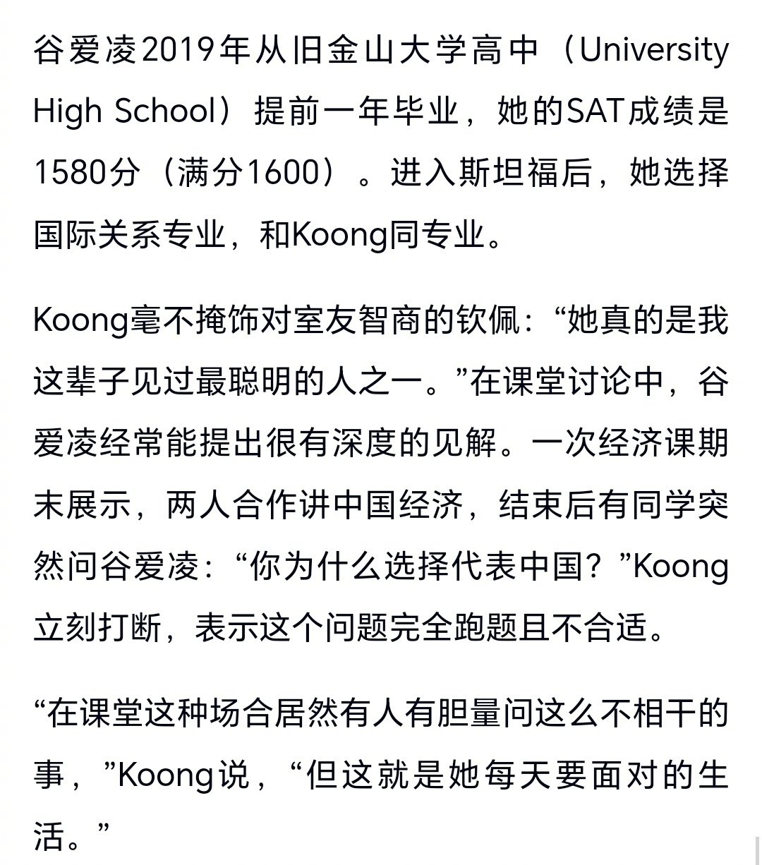 斯坦福室友说谷爱凌是她遇到过最聪明的人 《纽约时报》刊载了对谷爱凌斯坦福同学Konng的专访。Koong毫不掩饰对谷爱凌的钦佩:“她真的是我这辈子见过最聪明的人之一。”在课堂讨论中,谷爱凌经常能提出很有深度的见解。“你可能会以为很多名人都有巨大的自我,以为世界围着他们转,但我在电视上看到的她,和我每天相处的她,没有任何区别。”