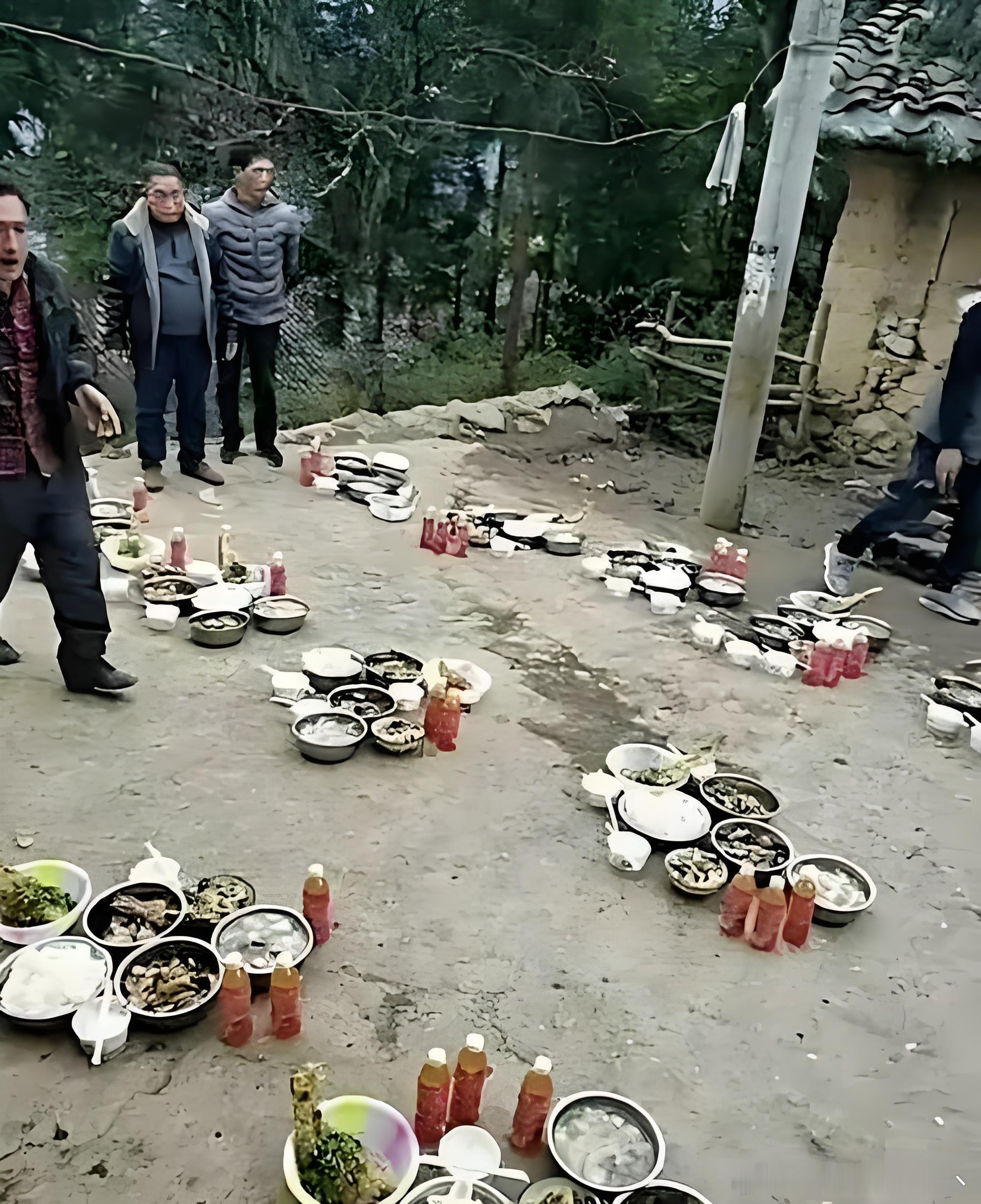 90年代我们这边丧事就是这样蹲在地上吃的,喜事才有桌子凳子。后来条件好一点了,2000年以后喜事丧事都有桌子和凳子[思考][思考]
