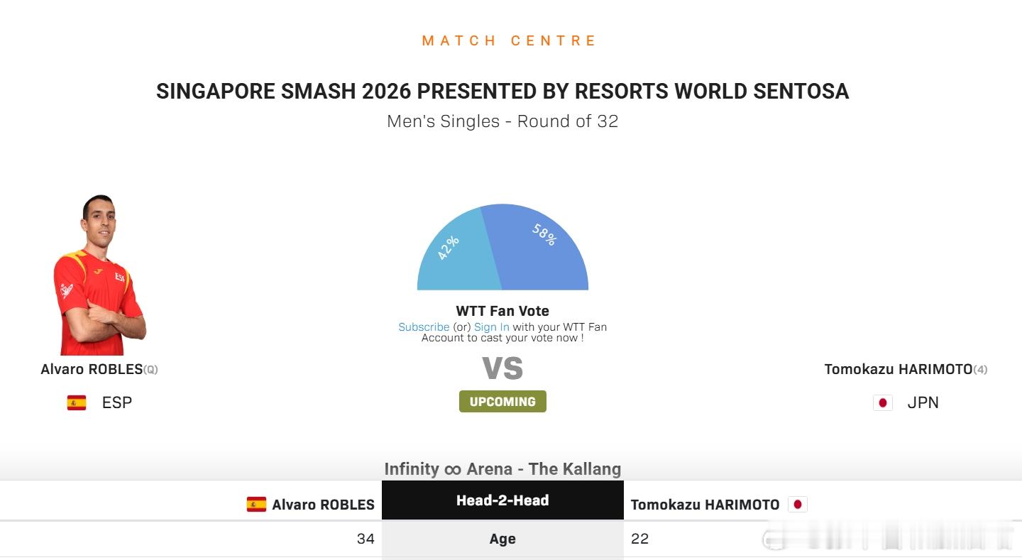 wtt新加坡大满贯2026张本智和 260225 男单 R32张本智和 Vs.罗伯勒斯北京时间12:35 桌号1