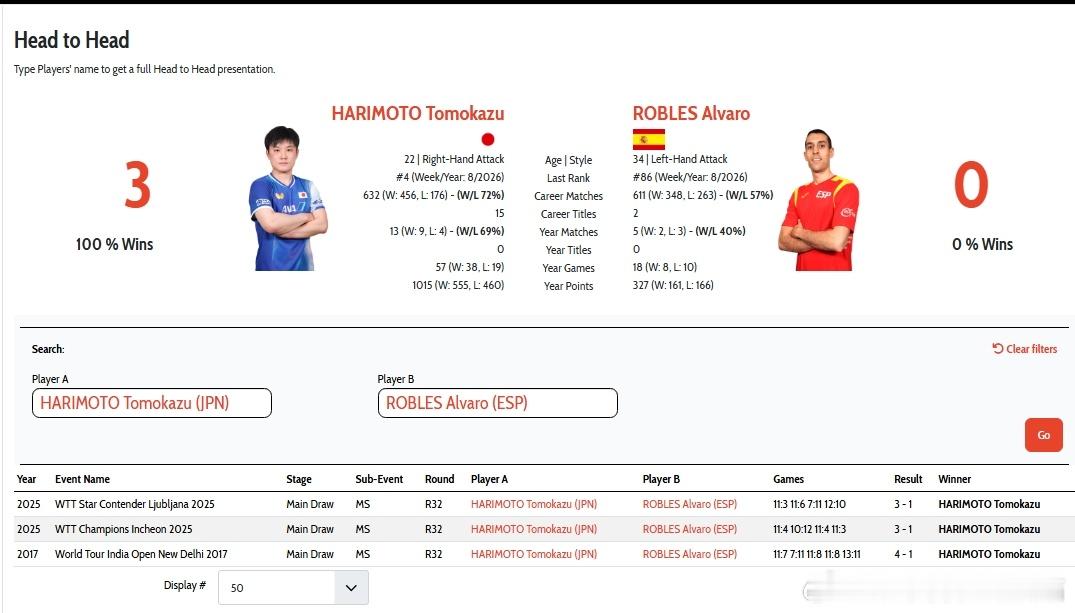 头对头记录3-025Ljubljana球挑 张本3-1罗伯勒斯(3,6,-7,10);25仁川冠军赛 张本3-1 罗伯勒斯(4,-10,4,3);17,41,详略。