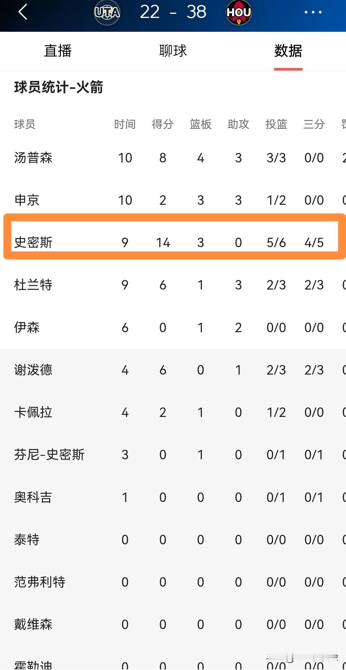 火箭大将小史密斯真是弹无虚发!在今天火箭主场迎战爵士的比赛中,目前双方的第一节比赛已经结束,火箭以38:22领先对手16分,可以说形势一片大好。在首节比赛中,小史密斯的投篮手感极其火热,他在首发出战的9分钟里,投篮6中5,其中三分球5中4狂砍14分,还有3篮板,他的场上正负值为+11。 以小史密斯在第一节比赛中的火热状态来看,如果他今天的得分不能突破40分,那么就对不起他如此滚烫的手感。