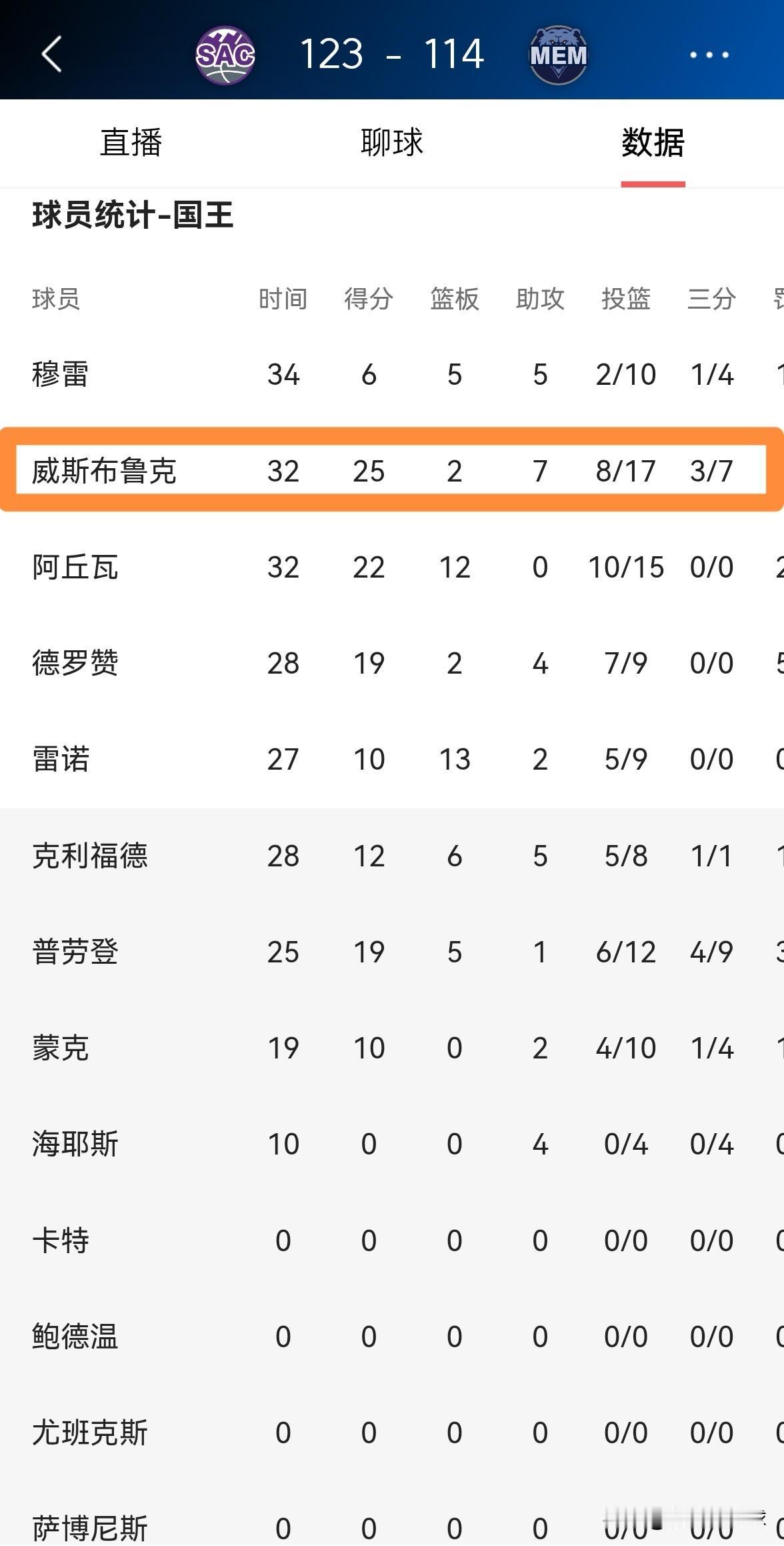 我必须要大肆称赞国王老将威斯布鲁克!在今天国王客场以123:114击败灰熊的比赛中,老将威斯布鲁克打出了非常精彩的表现,他是球队能够赢得胜利的最大功臣。 全场比赛下来,威少首发出战32分钟,投篮17中8,其中三分球7中3、罚球7中6砍下25分,外加2篮板7助攻1抢断,他的场上正负值为+9。 作为一名37岁的老将,威少依然能够打出如此出彩的表现,真是太难能可贵了,威少绝对值得被大肆称赞。