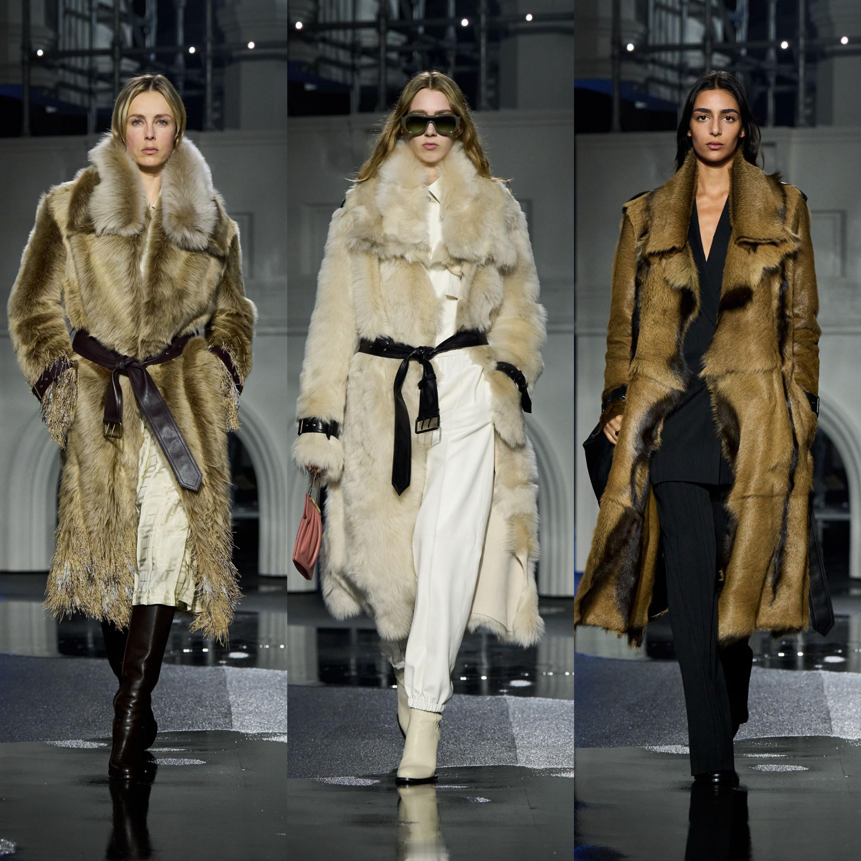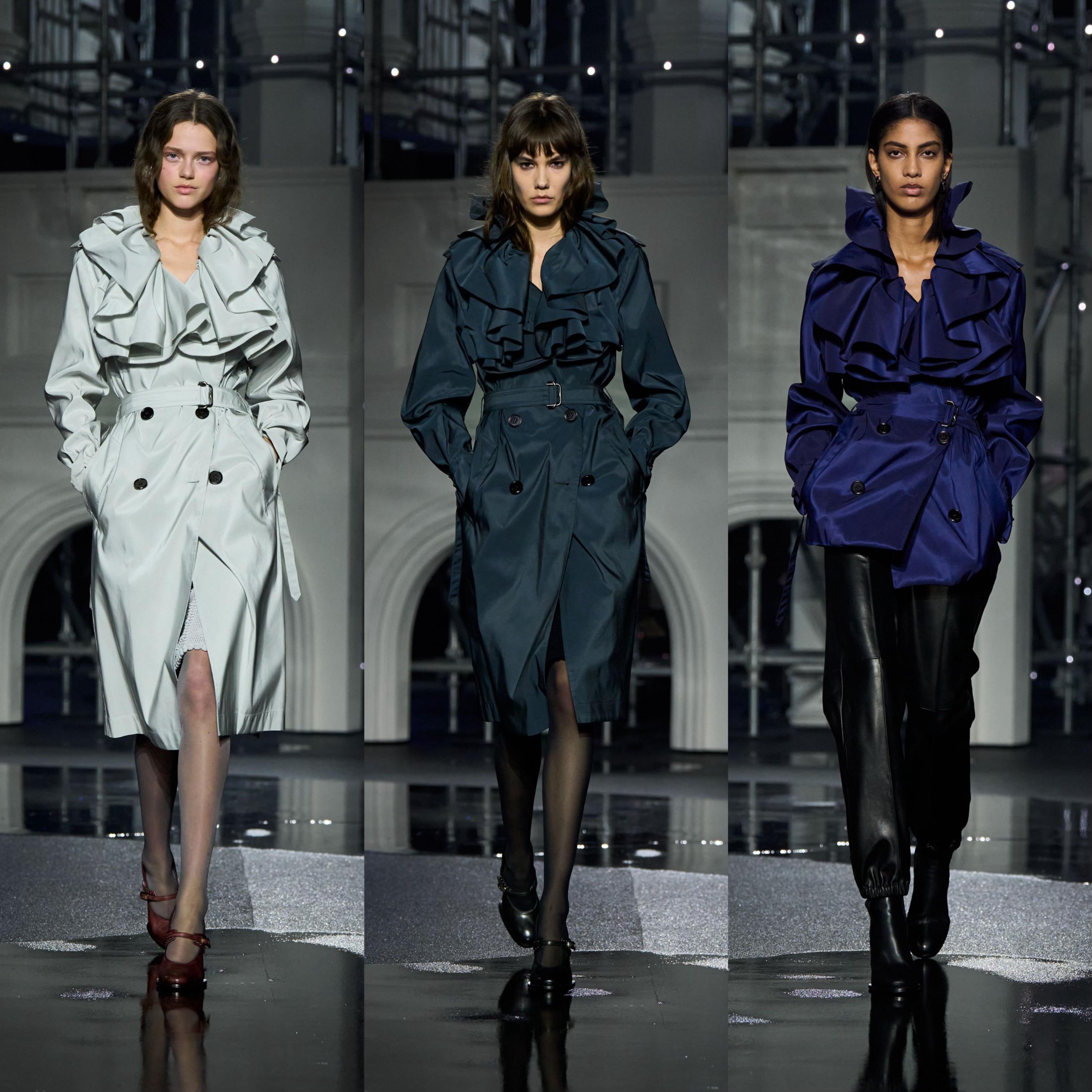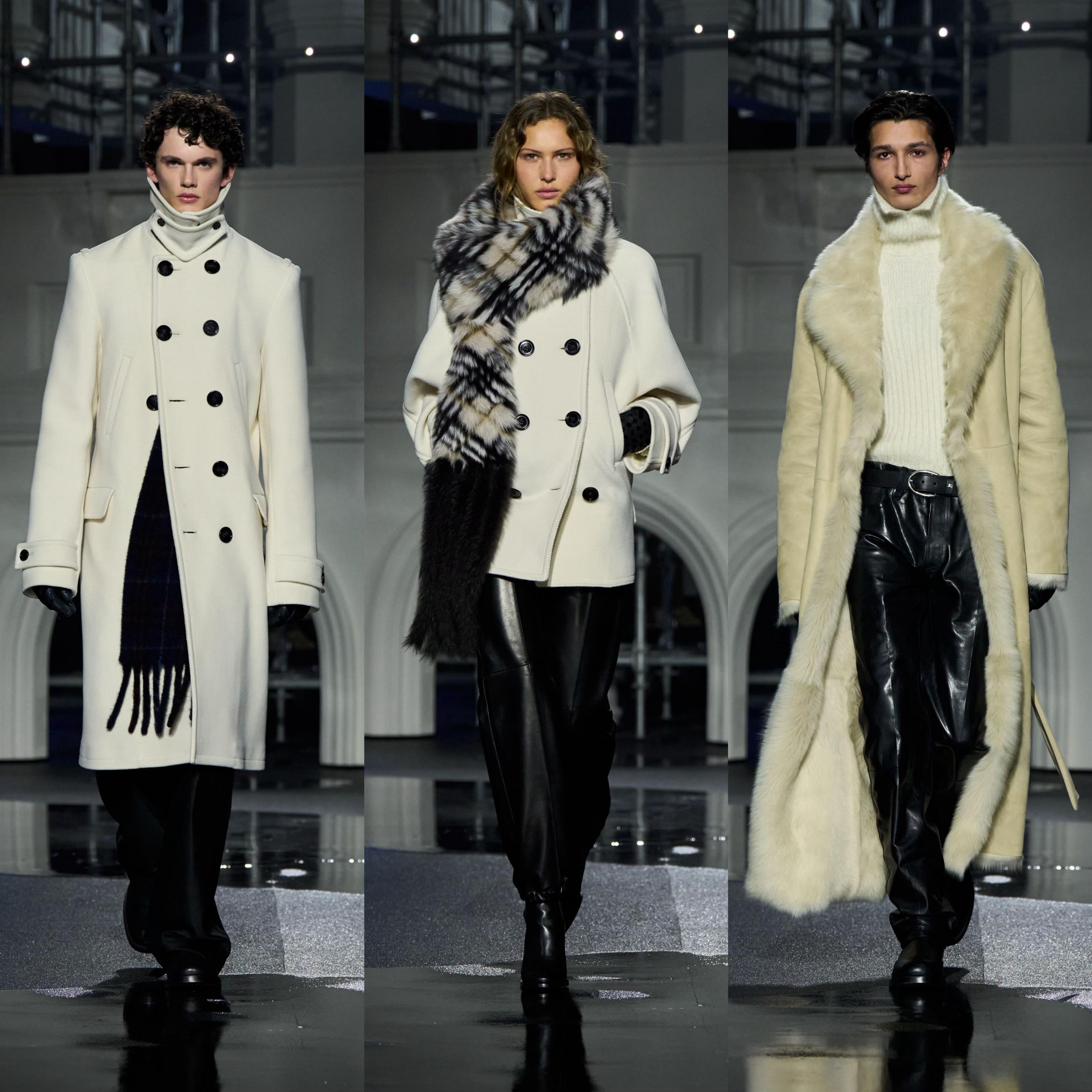 Daniel Lee 一如既往向品牌和英伦元素致敬,重塑标志性风衣与大衣,以利落廓形、丰富层次与精致结构展示,荷叶边、经典格纹的元素融入,另外本系列采用羊羔绒、皮革等高级面料尽显奢华质感。男款的外套、晚宴西装和丝质衬衣、皮革飞行夹克与风衣焕发优雅气息;利落摩登的女装犹如绰约多姿的夜行者,风衣内搭缎面裙装、外套的羊毛皮未经修饰或以格纹元素焕新演绎,风衣领口采用罗缎材质,华丽又雅致。