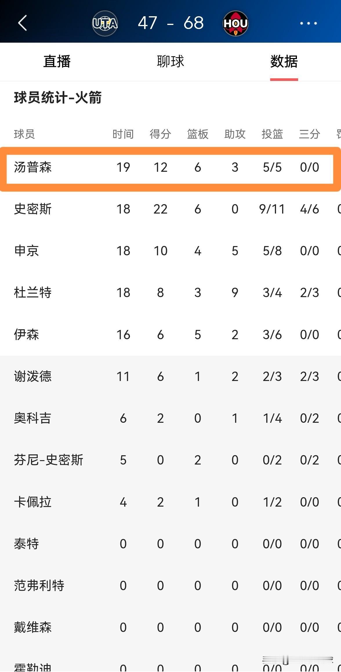 火箭球星阿门-汤普森的进攻效率真是高的离谱!在今天火箭主场迎战爵士的比赛中,目前两队的前两节比赛已经结束,火箭以68:47领先对手。在上半场比赛中,阿门首发出战19分钟,投篮5中5,其中罚球3中2极其高效的砍下12分,还有6篮板3助攻2抢断,他的场上正负值为+14。 如果硬要鸡蛋里挑骨头的话,阿门在前两节比赛中唯一美中不不足的地方在于他的失误数,他一共出现了4次失误,位居全队第一。