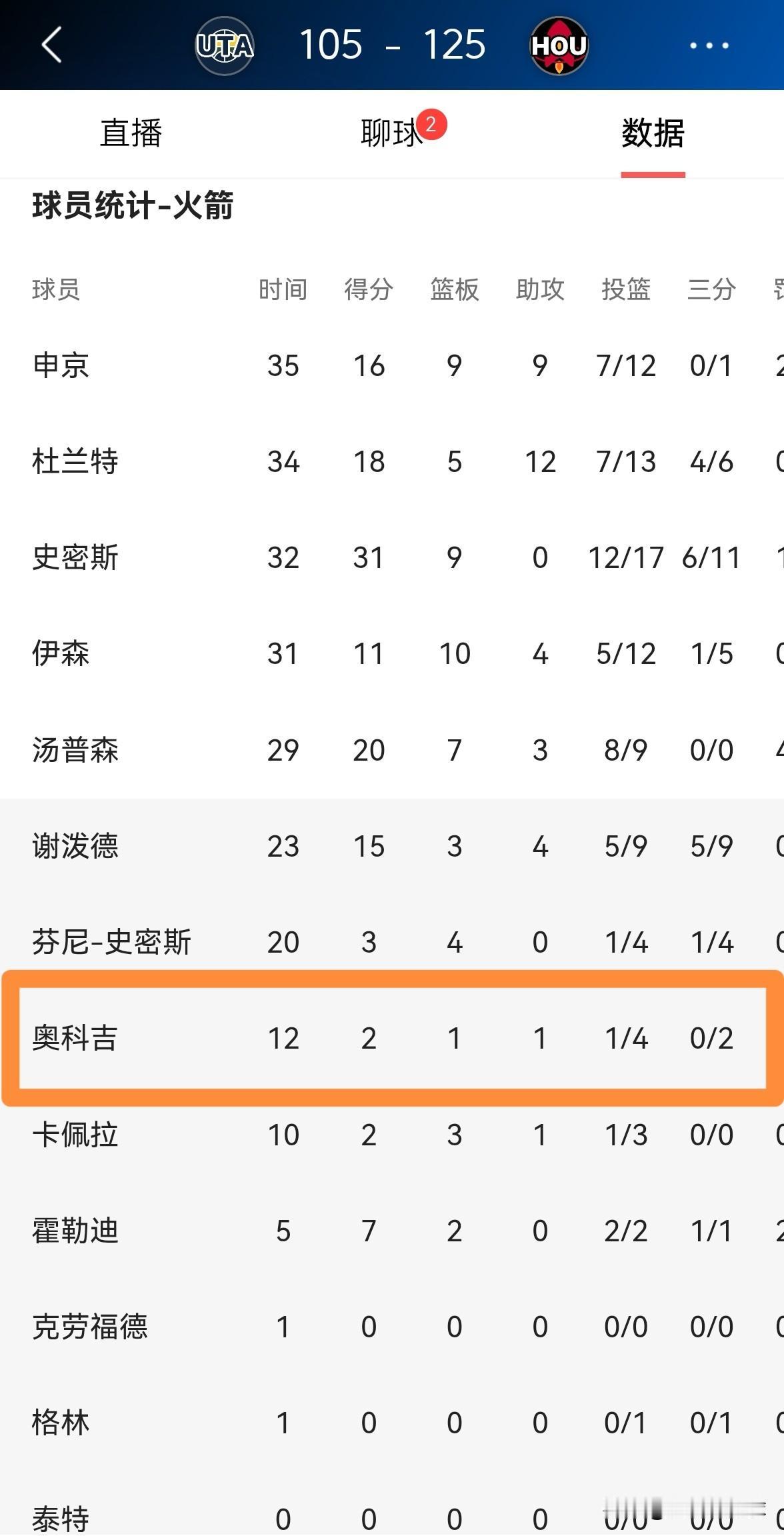 火箭悍将奥科吉真是给机会不中用!在今天火箭主场以125:105战胜爵士的比赛中,奥科吉在泰特因伤缺阵的情况下获得了出场机会,然而奥科吉的表现却不尽如人意。 整场比赛下来,奥科吉替补出战12分钟,投篮4中1,其中三分球2中0非常低效的得到2分,还有1次失误和2次犯规,他的场上正负值为+4。 说句不好听的,奥科吉这属于典型的给机会不中用,如果泰特没有受伤的话,奥科吉几乎很难获得上场机会。