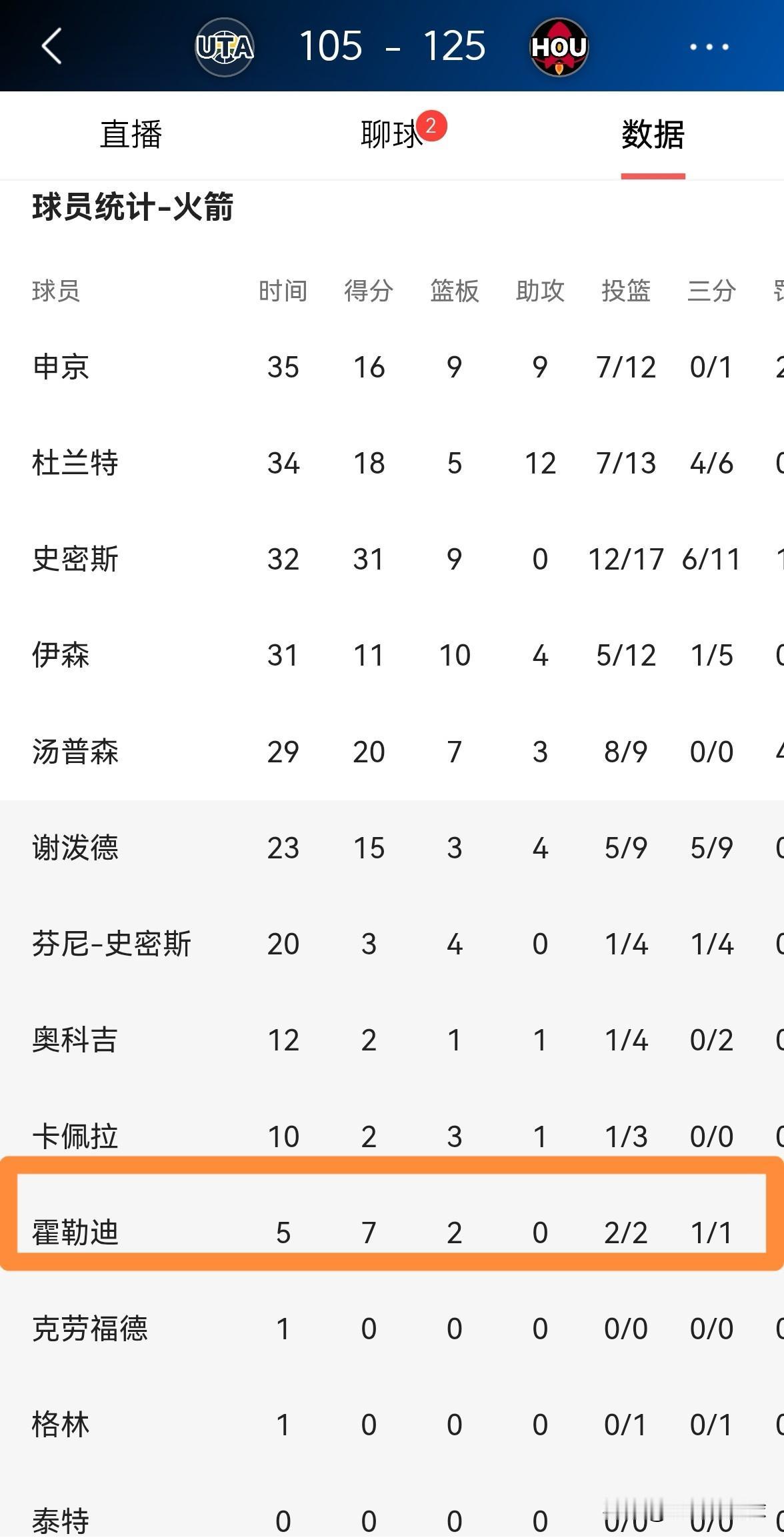 火箭大将霍勒迪真是太想得分了!在今天火箭主场以125:105轻取爵士的比赛中,霍勒迪在替补上场以后展现出了超强的得分欲望,他的眼里只有篮筐而没有队友。 全场比赛下来,霍勒迪替补出战5分钟,投篮2中2,其中三分球1中1、罚球2中2得到7分2篮板,他的场上正负值为+1。 说实话,我非常理解霍勒迪渴望得分的想法,因为霍勒迪已经好长时间没有获得出场机会了,他对得分已经到了如饥似渴的地步。