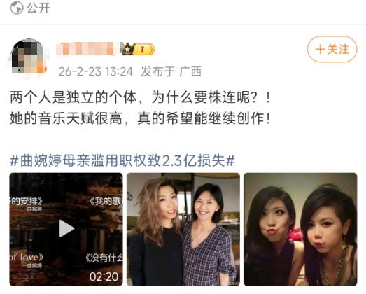 支持曲婉婷的,看来是一波人,这是宣传稿呢,还是真有人支持曲婉婷洗白曲婉婷? 曲婉婷这个名字,曾经因为一首传唱度极高的歌曲,走进了千家万户的耳朵里。 没人会把她的生活和巨额的不当利益联系在一起,更没人想到,她看似光鲜的人生背后,藏着无数家庭的心酸与泪水。 她在海外优渥的生活,并非完全来自自己的音乐事业,而是和她母亲涉案的巨额资金有着千丝万缕的联系。 这笔钱不是普通的财富,而是来自无数普通民众的血汗,是本该用于保障职工生活、维护公共利益的资金。 她在海外的每一笔开销,每一次享受,都很难和这笔涉案资金撇清关系。 而这些钱,原本可以让数百个家庭过上安稳的日子,让辛苦工作一辈子的职工拿到应有的补偿,让无数普通人不用在生活的困境里苦苦挣扎。 可直到现在,这笔巨额资金依旧没能完整追回,核心原因就在于,大部分资金早已被转移使用,在海外被消耗殆尽。 曲婉婷作为直接受益人,始终没有主动配合资金追缴工作,没有拿出任何实际行动来弥补过错,只是偶尔在社交平台发布一些看似思念母亲的文字,扮演着隔空尽孝的角色。 在她的认知里,母亲是给予她优质生活的英雄,却忽略了这位英雄的背后,是数百个家庭的破碎,是无数普通人的绝望。 这种毫无愧疚的态度,才是让大众无法接受的关键,也是她始终无法被原谅的原因。 没想到,她竟然还有胆量开通个人的社交账号。 可网友们没有忘记当年的案件,没有忘记那些受害的家庭,纷纷要求她先退还赃款,给大众一个交代,再谈复出和音乐。 眼看舆论走向不受控制,账号迅速开启了仅作者可评论的功能,试图屏蔽负面声音,可即便如此,也没能挡住大众的抵制情绪。 大众的记忆不会轻易消失,底线也不会轻易退让。 而那些在网络上为她发声的人,话术高度相似,要么强调她的音乐才华,要么拿祸不及子女当借口,要么呼吁把人和作品分开,完全避开涉案资金、受害家庭、拒不退赃这些核心问题。 这样的支持显得格外苍白,也格外刻意,很难让人相信是普通网友的自发行为。 更像是有组织有计划的宣传操作,目的就是混淆视听,淡化她身上的争议,为她的复出铺路。 祸不及子女的前提是子女没有享受过错带来的利益,没有在明知资金来源不当的情况下,依旧心安理得地挥霍。 曲婉婷显然不属于这个范畴,她是母亲涉案行为的直接受益者,她的海外生活、音乐事业,都离不开这笔沾满血泪的资金支撑。 享受了利益,却不想承担任何责任,躲在海外逍遥自在,对国内的受害家庭视而不见。 那些被侵占的资金,是国家的公共财产,是无数职工的安置费用,是老百姓的血汗钱,每一分每一厘都不该被肆意挥霍。 资金无法追回,意味着国家财产遭受了巨大损失,意味着数百个家庭的合法权益得不到保障,意味着有人用他人的苦难,成就了自己的人生。 这种巨大的不公,大众看在眼里,记在心里,自然不会轻易妥协,更不会任由洗白言论肆意传播。 曲婉婷及其背后试图洗白的势力,无论用什么样的话术,做什么样的操作,都无法改变既定的事实,更无法撼动大众心中的底线。 音乐本身没有对错,才华也不该成为洗白的遮羞布,一个艺人想要被大众喜爱,不仅要有优秀的作品,更要有端正的品行,要有基本的良知与底线。 享受着不当利益,无视他人痛苦,拒不承担责任,这样的人,即便歌声再动听,也无法赢得真正的尊重,更不配站在公众面前收获掌声与收益。 网络不是法外之地,也不是洗白的温床,大众的眼睛是雪亮的,不会被片面的话术蒙蔽,不会忘记那些遭受苦难的家庭,更不会容忍用民众血汗钱享乐的人轻易复出。 公众抵制的从来不是音乐本身,而是拒不认错、拒不担责的态度,是侵占公共财产、损害民众利益的行为,是用他人血泪成就自己人生的自私。 只要涉案资金没有追回,只要没有给受害家庭一个交代,洗白就永远不会成功,复出就永远没有可能。 对于这件事,您有什么想说的吗?欢迎评论区留言讨论。 信息来源: 粤港澳观察 2026-2-24 网友爆料贪二代曲婉婷在加国坠入斩杀线后孤注一掷要在中国复出,万万没想到“试水”一夜之间竟收获1.1万粉丝和27.9万点赞!居然还有脑残粉出来替她“洗地”!