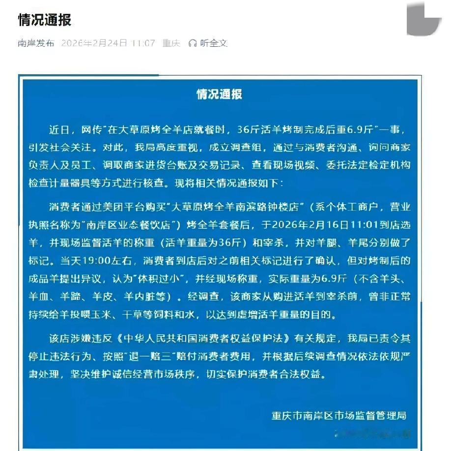 重庆“36斤活羊烤制完成后仅重6.9斤”的情况通报出来了:商家曾非正常持续给羊投喂玉米、干草等饲料和水! 网友锐评:昨天这个事情曝光出来后,评论区一堆吃过的,说36斤活羊烤完后也就八九斤的样子,7斤也大差不差的大有人在,看来挨宰的还是有挺多人。他们没有想过这些羊在他们确认之前就已经被做过手脚了,烤制过程中基本是不会动手脚的,说换了一头的更是不太可能的。 评论区诸位看官,你们怎么看?