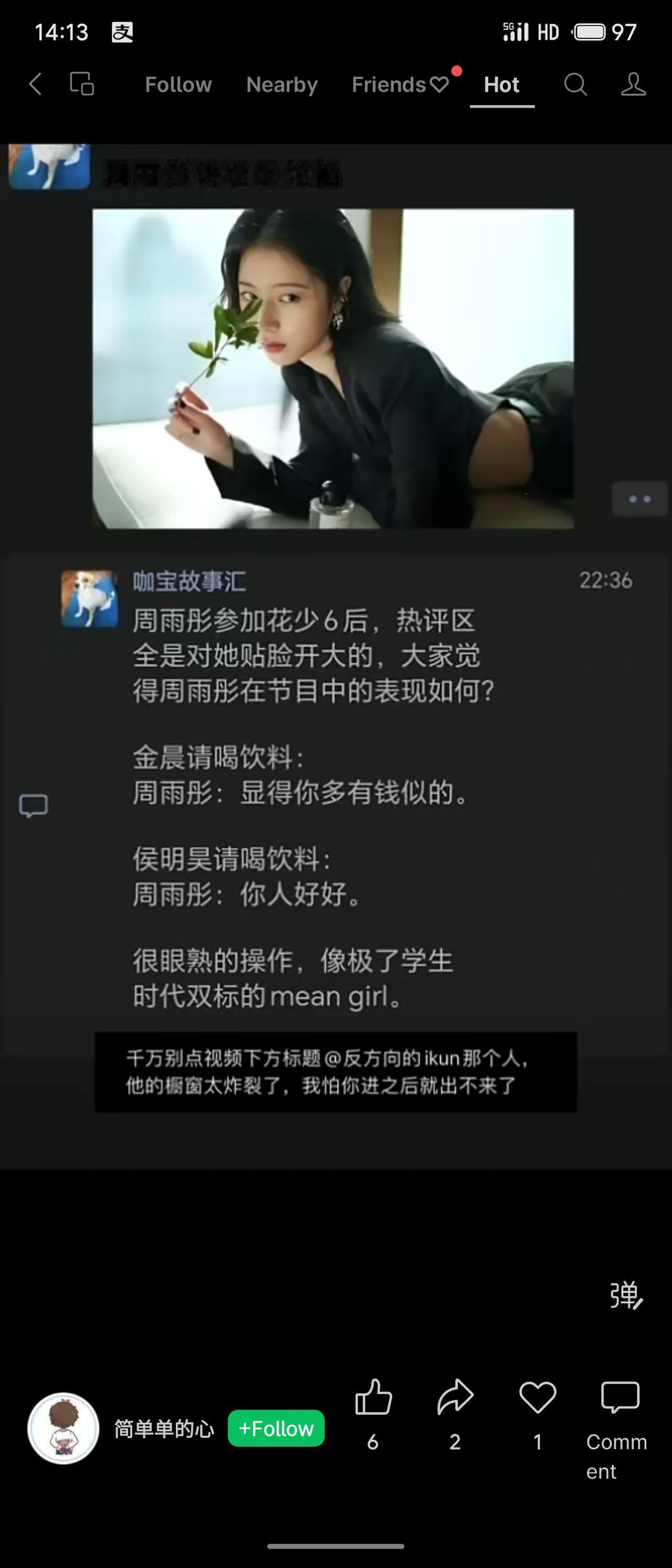 周雨彤因《花少6》中对金晨和侯明昊请客的双标态度引发争议,评论区出现大量负面反馈,被指像学生时代讨人厌的“mean girl”。