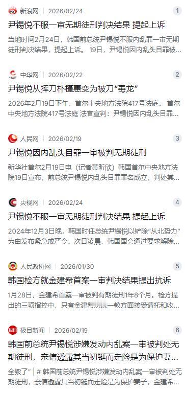 金建希的天彻底塌了,尹锡悦最终被宣判了,是无期徒刑,也就是说,从此金建希将再也看不到自己的丈夫了。她想和丈夫继续生活的愿望彻底没了! 麻烦看官老爷们右上角点击一下“关注”,既方便您进行讨论和分享,又能给您带来不一样的参与感,感谢您的支持! 2026年2月24日,首尔中央地方法院外依旧聚集着大批人群,但一切已经尘埃落定。就在五天前,韩国前总统尹锡悦因内乱头目罪被一审判处无期徒刑。而今天,他虽然提起了上诉,但法律的绞索已经收紧——这位曾经风光无限的检察官出身的总统,大概率要在牢里度过余生了 。消息传出来的时候,最受打击的恐怕不是尹锡悦本人,而是他的妻子金建希。 金建希现在的处境,用“天塌了”来形容一点都不过分。虽然她自己也在今年1月底因收受名牌包等罪名被判了有期徒刑1年零8个月,但这个刑期和无期徒刑比起来,简直是小巫见大巫 。也就是说,当金建希可能在几年后走出监狱大门的时候,尹锡悦却只能在铁窗后面看着岁月流逝。这对于一对结婚多年的夫妻来说,无异于生离死别。 回顾这整件事,最让人觉得荒唐的,是尹锡悦当初为什么要铤而走险。根据特检组和媒体的后续爆料,这位前总统之所以在2024年12月3日深夜突然宣布紧急戒严,甚至往国会派兵,很大程度上是被“金建希风险”给逼急了 。当时在野党步步紧逼,马上就要通过针对他夫人的“金建希特检法”。为了保护妻子不被司法追究,尹锡悦选择了最极端的方式,结果不仅没能护住妻子,反而把自己搭了进去。 法院的判决书写得很清楚,尹锡悦的行为不仅仅是宣布戒严那么简单,关键在于他试图让国会瘫痪,这就踩到了韩国宪政的红线 。曾经,他是把朴槿惠和李明博送进监狱的“铁面检察官”,那时候的他大概做梦也想不到,有一天自己会以更重的罪名成为“青瓦台魔咒”的最新注脚 。命运的讽刺莫过于此,当年他对前任挥下的刀,如今以更锋利的方式砍了回来。 更有意思的是,在尹锡悦被拘留和审判的这段时间里,关于他们夫妻关系的各种细节也被扒了出来。有亲信向媒体透露,当初戒严失败后,尹锡悦凌晨回到官邸,迎接他的不是妻子的安慰,而是劈头盖脸的怒骂。金建希当时崩溃地喊道:“原本还有很多计划,因为你,全毁了。” 这句话现在听起来,简直像是一语成谶。尹锡悦本想用权力为妻子遮风挡雨,结果却引发了摧毁一切的政治海啸。 对于金建希来说,接下来的日子无疑是煎熬的。她自己的案子虽然判了,但检方已经提出抗诉,后续可能还会加刑。即便她运气好,服完刑就能出来,外面的世界也已经没有丈夫的陪伴了。今年已经54岁的她,如果尹锡悦上诉后维持原判,她将在外面的世界里守着一个空荡荡的家,而丈夫将在监狱里度过至少二十个春秋。对于任何人来说,这都是难以承受的重量。 当然,也有人替金建希感到不值。如果不是嫁给尹锡悦,她可能还是一个策展公司的老板,过着富足且平静的生活。但自从丈夫踏入政坛顶端,她的过往被一点点挖出来接受公众审判,母亲的丑闻、论文的抄袭、收受的包包,全都成了压垮丈夫政治生涯的稻草。尹锡悦曾在幕僚面前愧疚地说过:“要是没遇到我,她本可以过得很好。”这句话现在听起来,多了一份凄凉的宿命感。 韩国的政治斗争向来残酷,这一次也不例外。尹锡悦的支持者认为这是政治清算,但对于金建希来说,这些都不重要了。她面临的现实是:从今往后,无论是逢年过节,还是生病住院,那个曾经和她一起住在汉南洞官邸的男人,都不在身边了。想见一面,只能隔着监狱冰冷的玻璃。对于一个妻子来说,这种失去,比任何政治上的失败都要惨痛。 今天这个判决落地,金建希心里估计比谁都清楚:她想和丈夫继续过日子的那点念想,彻底没了。无论未来她是否上诉、是否减刑,她和尹锡悦的人生轨道都已经彻底错开。这不仅仅是“青瓦台魔咒”的又一次应验,更像是一场关于权力、爱情和毁灭的现实悲剧。