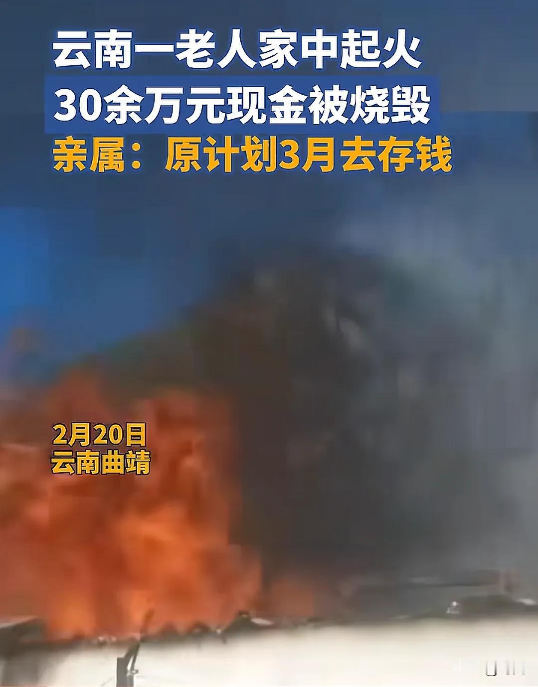 老人家中放30万现金,结果起火全部烧成灰,家属希望银行能够协助更换钞票。事发2月20日下午时间,在云南省曲靖市会泽县大海乡大菜园村一农户家,突然发生大火,由于家中无人,导致存放在抽屉的30多万全部烧毁。 老人子女称,这些钱都是老人几十年靠买家畜和蔬菜以及小生意的积蓄,由于老人不会用网络支付,只能收现金,计划是2026年3月去存银行,没想到发生这样的事。灭火后,家属在废墟中找到现金,已经基本全部成为灰烬,家属表示这些钱等于是国家资产无故消失了,希望银行可以帮忙恢复更换。 有关专家表示,居民的现金如果被损坏,银行和国家没有任何赔偿责任。但是居民可以携带未完全毁坏的现金到银行去鉴定,然后挽回一部分损失。完整面积大于3/4:按照面额全额兑换,剩余面积超过一半:可以半额兑换,剩余小于1/2或者已无法辨别:无法兑换。 老人现金被烧 老人家中起火30万现金被烧毁 现金被烧毁可以找银行赔钱吗