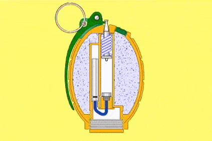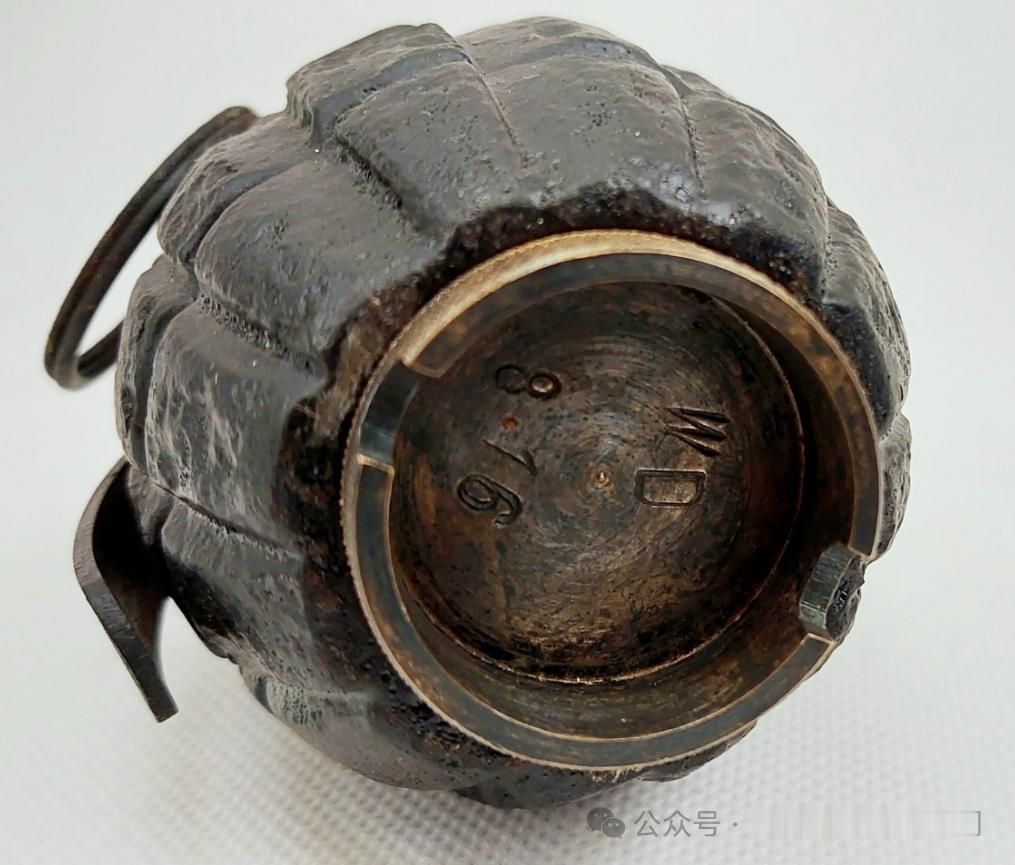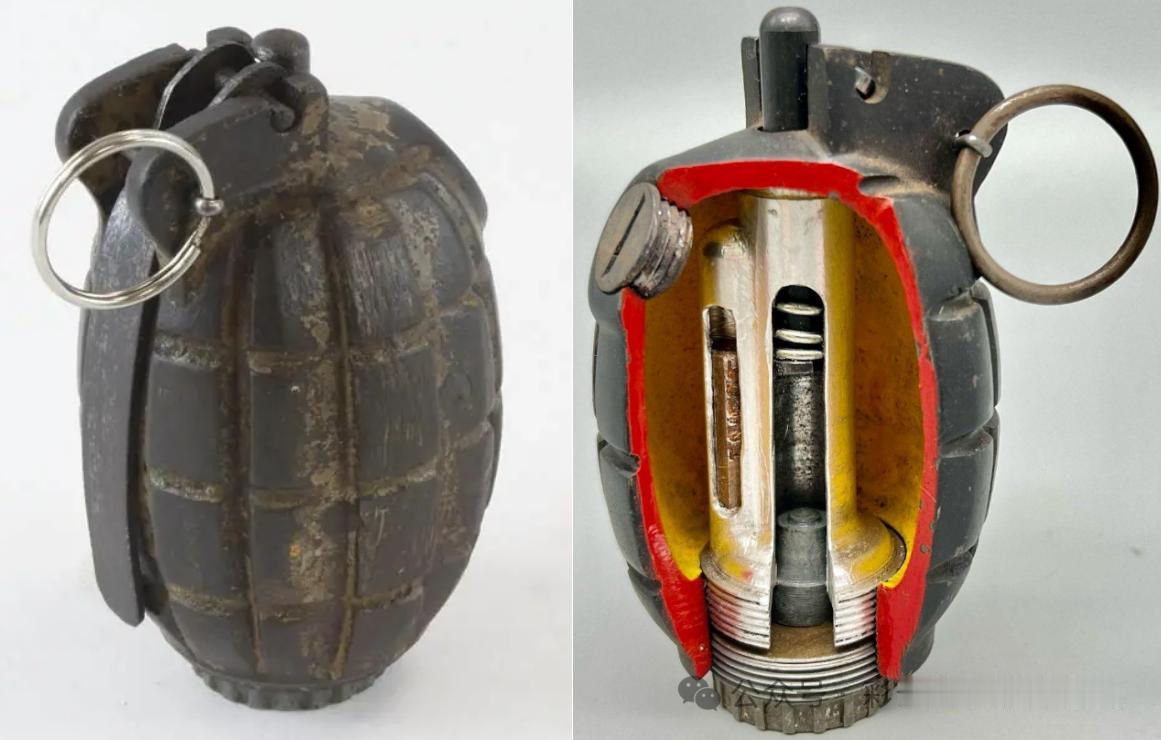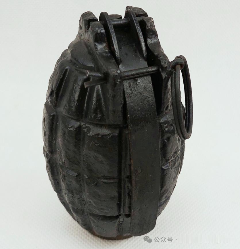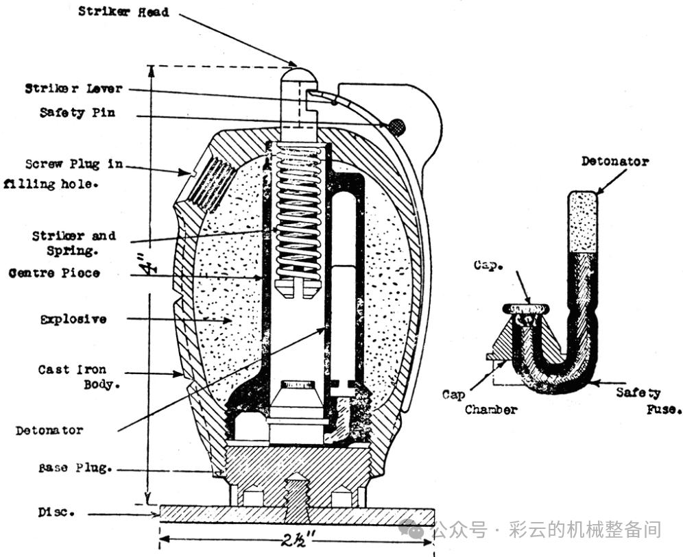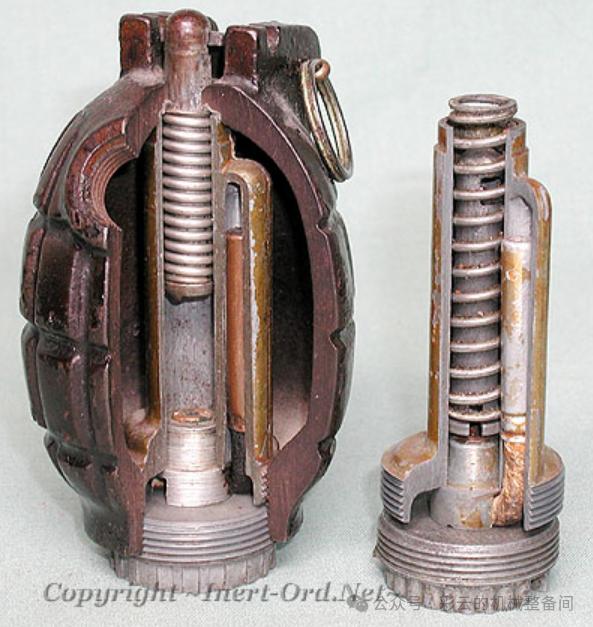 “米尔斯”破片手榴弹:1914年英国的威廉·米尔斯爵士(William Mills)参考比利时上尉莱昂·罗兰(Leon Roland)设计的“罗兰”手榴弹加以改进。 “米尔斯”手榴弹保险握片+击针击发结构,引信装在弹体中央,由保险握片、中心管、击针、击针簧、火帽、导火索和雷管组成。