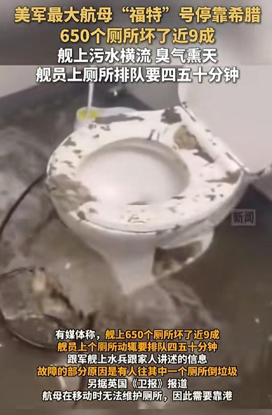美国海军这次可真是闹了大笑话!福特号航母号称全球最先进,造价130亿美元,结果650个厕所坏了近9成,只剩约70个能用。这航母上搭载4600多名舰员,上厕所都得排队40到50分钟,部分区域污水横流、异味刺鼻。 这故障并非偶然。一方面是先天设计有硬伤,真空集便系统管道细、弯道多,一处故障就导致大片厕所瘫痪,2020年就被指出问题却没彻底整改。另一方面长期超期部署,维护不足,舰员还违规扔杂物,加剧了系统崩溃。可怜那些士兵,任务压力大还得忍受这糟糕的如厕条件,估计都想赶紧逃离这“厕所航母”了。