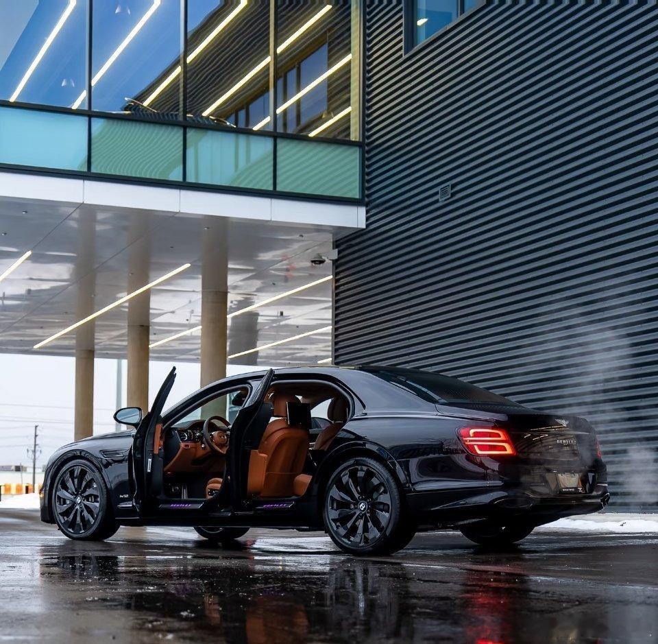 采用宾利标志性的宝石黑车漆,搭配黑色多辐式轮毂,气场沉稳而富有力量感。车尾的“双8”造型LED尾灯是其辨识度极高的设计元素。