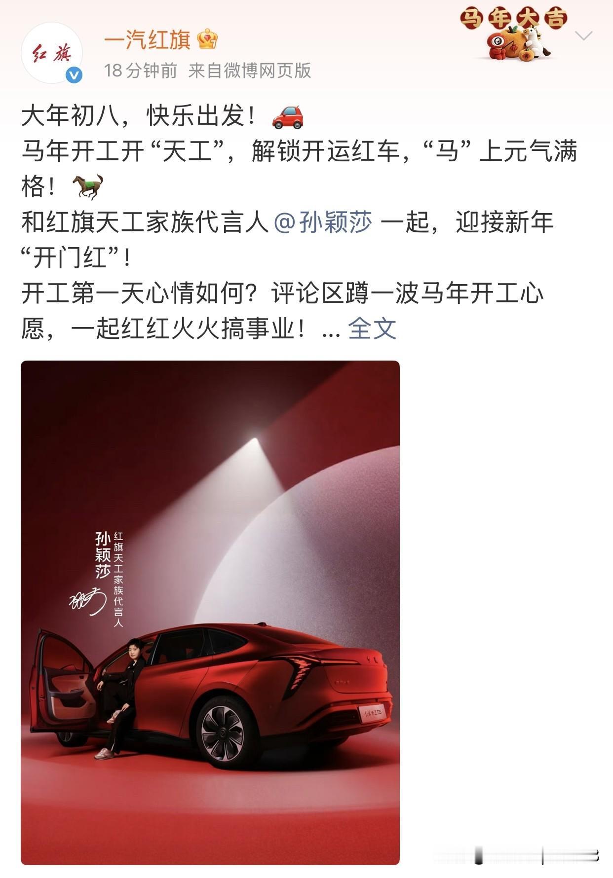 孙颖莎这也太帅了吧,红旗和孙颖莎一起,迎接新年开门红。 大年初八,红旗发文,和代言人孙颖莎一起,祝福大家开工快乐。 红旗的物料挺多的,看来莎莎最近拍了一些, 坐在车上,这个姿势,这个迈腿,简直是太帅了。 就是这张圆圆的脸蛋,超级的福相, 又可爱,又强大。 莎莎打球,大家开始快乐上班, 一切都是美好的, 新的一年,一起加油!