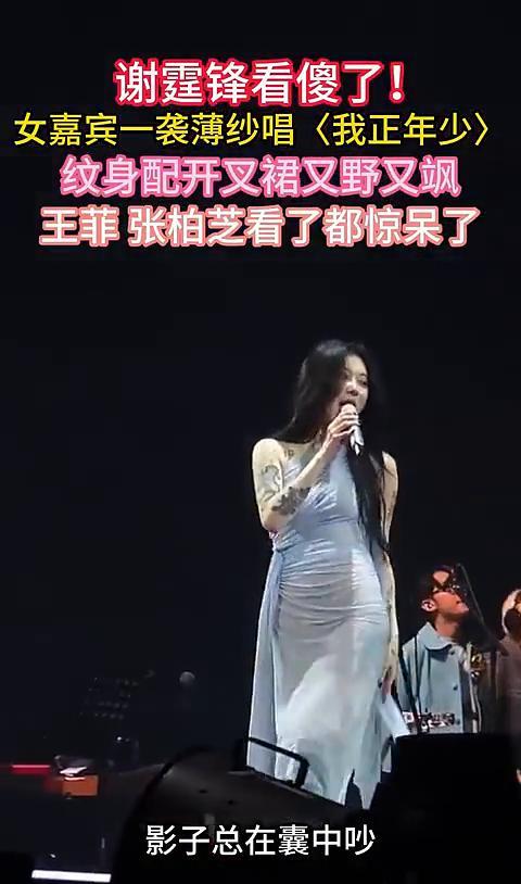 谢霆锋在台下直接瞪大眼睛,手里的笔都忘了转。 不是礼貌性鼓掌,是那种被击穿后愣住了的表情。 台上姑娘一袭薄纱开叉裙,抱着吉他。 高音劈上去的瞬间,她一脚踩在舞台监听上,身体后仰的弧度像一张拉满的弓。 歌词她改了几个字:“醉里挑灯看剑,剑光撞碎的不是酒,是规矩。 ”你感受一下那股劲。 那不是表演,是宣告。 谢霆锋往后一仰,笑了。 这一行里他见过太多“个性”,但这个不一样——不是标新立异,而是告诉所有人:我的场子,我就是规矩。 风正吹,浪正高,你我正年少。