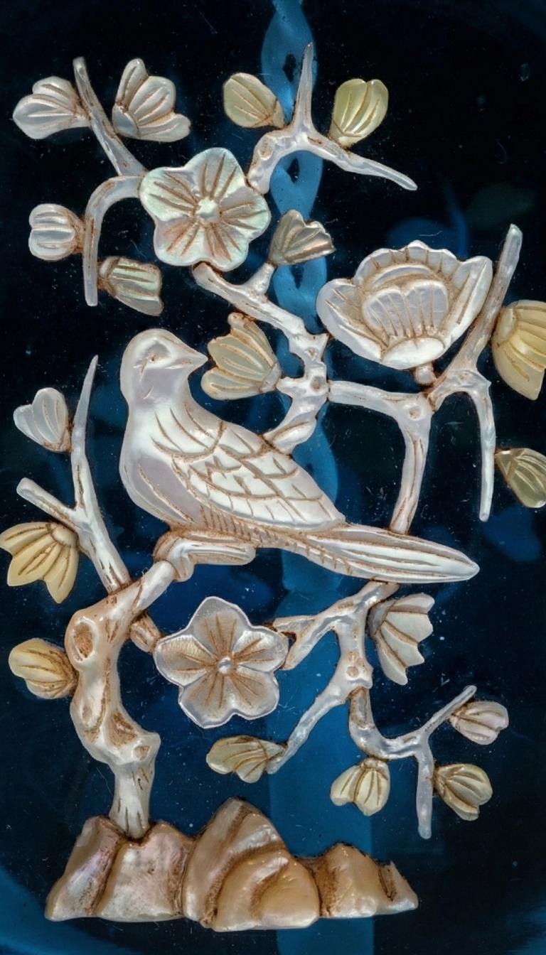 白色梅花与喜鹊悬浮其上,像一场缓慢的呼吸