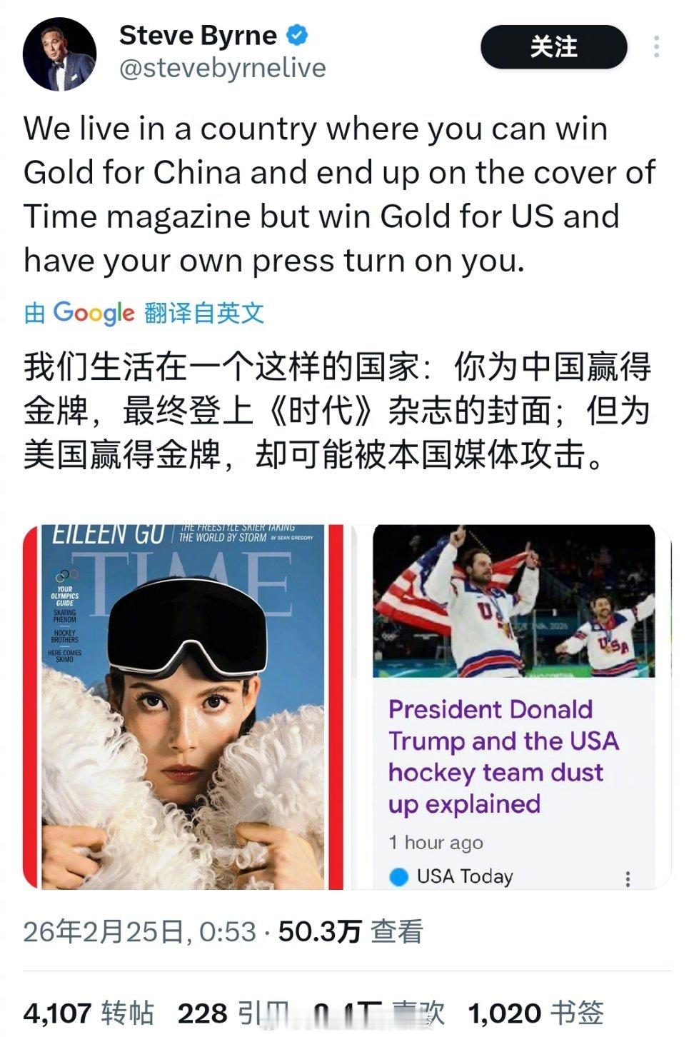 来自美国网友的感叹:在我们生活的国家,你为中国赢得金牌,最终登上《时代》杂志的封面,但为美国赢得金牌,却可能被本国媒体攻击。谷爱凌U槽卫冕英媒质疑打分
