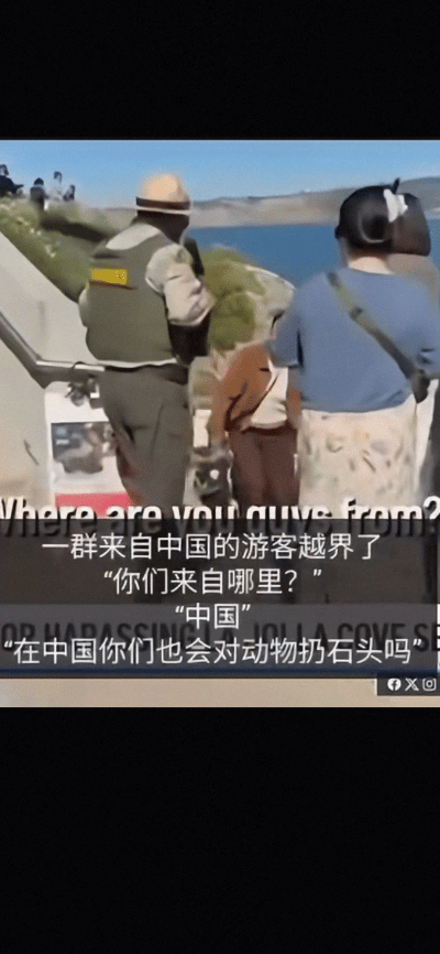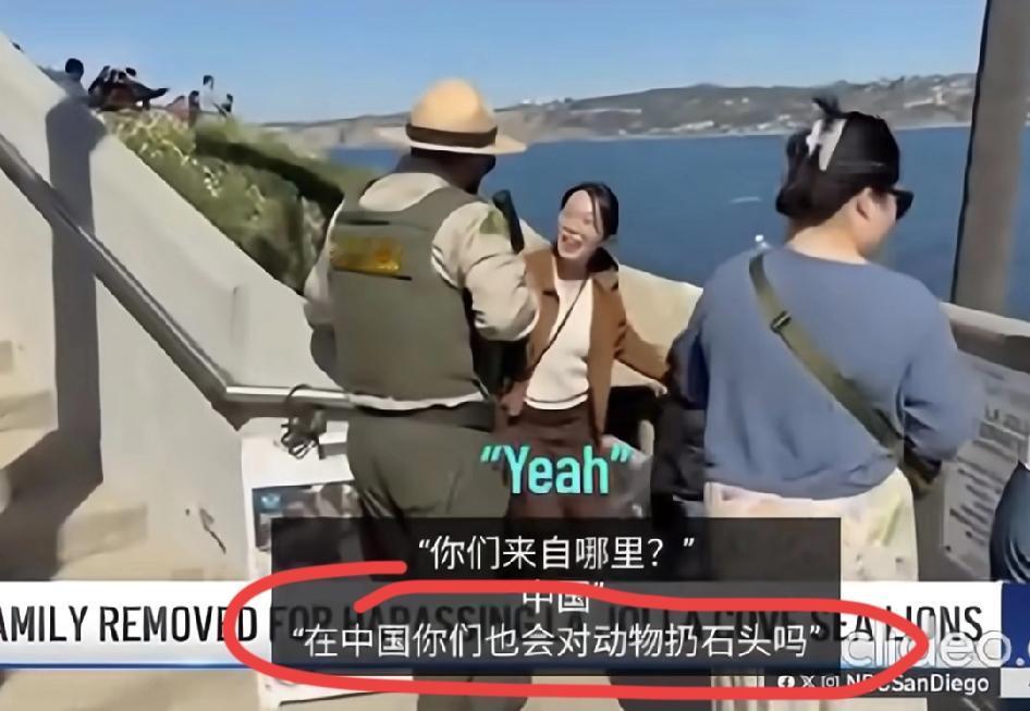 这位宝妈真得很颠,看见有人拍照有人采访笑着就过来了,结果因为教子无方被驱逐出圣迭戈的海狮海滩。 现在正好是加州海狮的生育季,雌性海狮会到沙滩上产崽,周边已经围上了,游客不能靠近。 宝妈的孩子用石子砸海狮,管理员制止几次无果,才把他们叫上来,并问出诛心的那句话。(图四标记处) 太丢人了! 因为情节不算严重,没给开罚单,只是驱离。 据称如果严格按“海洋哺乳动物保护法”来,每一次最高会判1年+3万刀罚款。 这趟出国游,就算是长教训了。