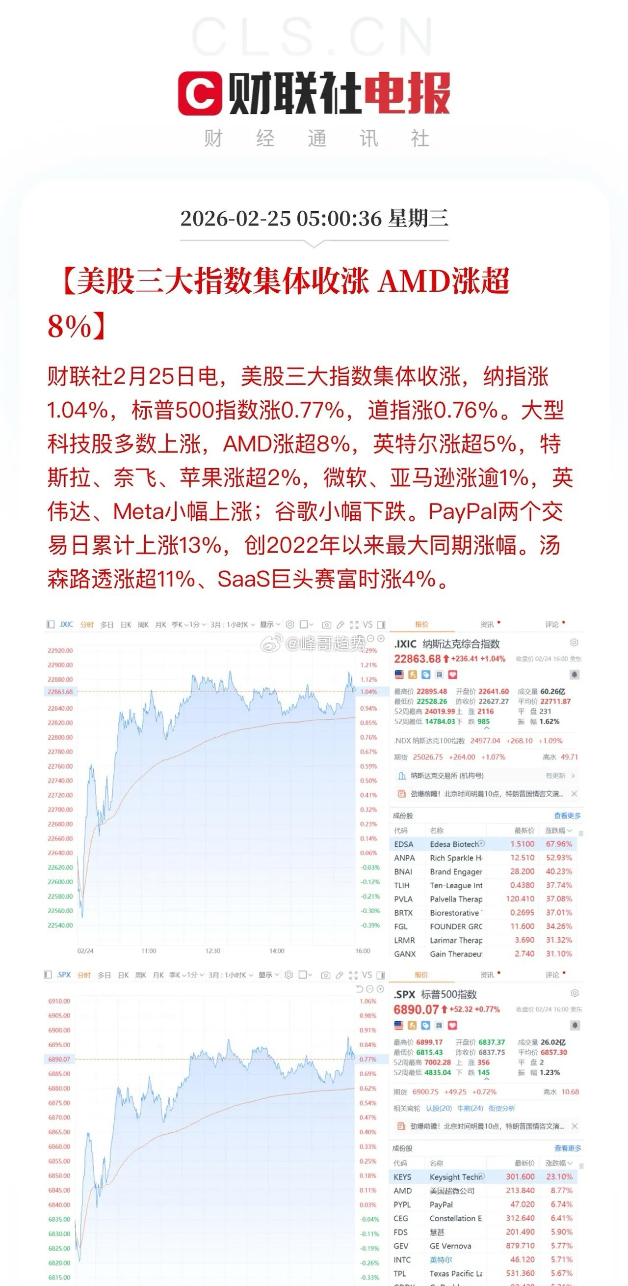 隔夜美股在A股带领下收获普涨!“科技七巨头看到了A股Ai旺盛需求,坚定了长期资本投入有回报的信心。”换个角度和提法多提气…美国支付巨头Paypal铁树开花,两个交易日大涨13%,这家在移动互联网电商时代错过中国市场的公司,前期股价暴跌触发市场收购热情。这是一家华尔街意难平的公司,当年输给了阿里巴巴后一蹶不振,就这么输掉了万亿美元市场的光明前景,欧美市场移动支付也严重落后东大10年!都吆喝着让我们开放金融市场,实际上欧美的金融市场才是全世界最封闭的,高进入门槛,银行系统强监管牢牢把控着金融流通。从唐朝开始,只要我们东方龙搞经济发展,都是全世界最开放、包容的地方。宝洁、麦当劳、可口可乐、苹果、特斯拉、微软都是在中国市场加持下才有大成功。财经