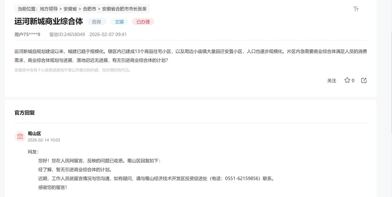 合肥运河新城建议引进商业综合体。 官方回复,暂无引进商业综合体的计划。现在主要是