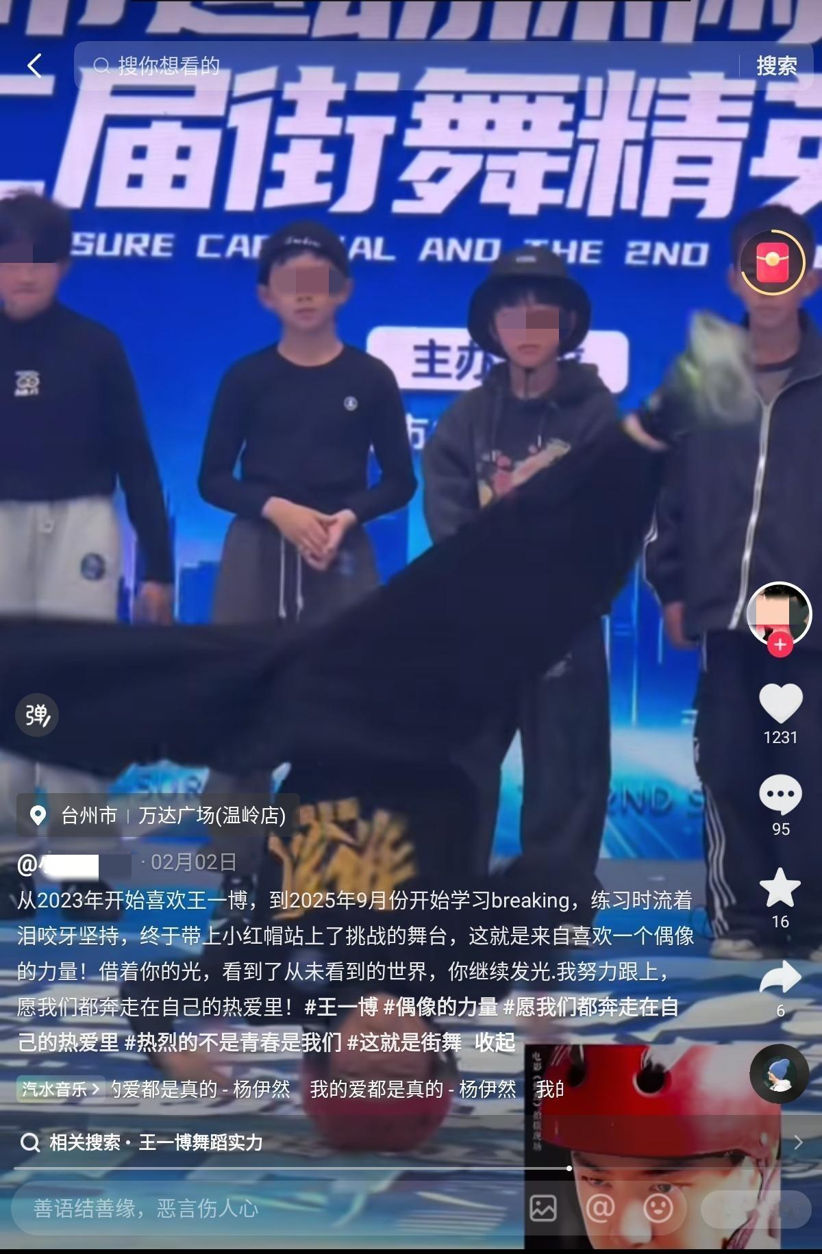 王一博春晚舞台爆火,他在街舞圈的地位太好了,翻跳挑战大赛出来了无数小迷弟迷妹,很多是一些少年团或街舞团的小舞者,说不定未来他们当中会出现一些内娱的新生力量。 图12两个小迷弟特逗。一个翻跳“刮地板”那一段(他们团几个好像都跳了),难度太大摔跤了,感觉腰要扭断了,他的队友说他老腰都没站起来。孩子们,你们这个年纪哪有“老腰”?[大笑] 迷弟中有不少是因为王一博去学街舞的。图3的小男孩穿着热烈的T恤,戴着陈烁同款小红帽去打比赛,他在台上头转时,背后站着其它的参赛小选手,这个画面让人想到陈烁,又想到当年参加全国街舞大赛的少年王一博。 这就是《热烈》的意义、偶像的意义啊。