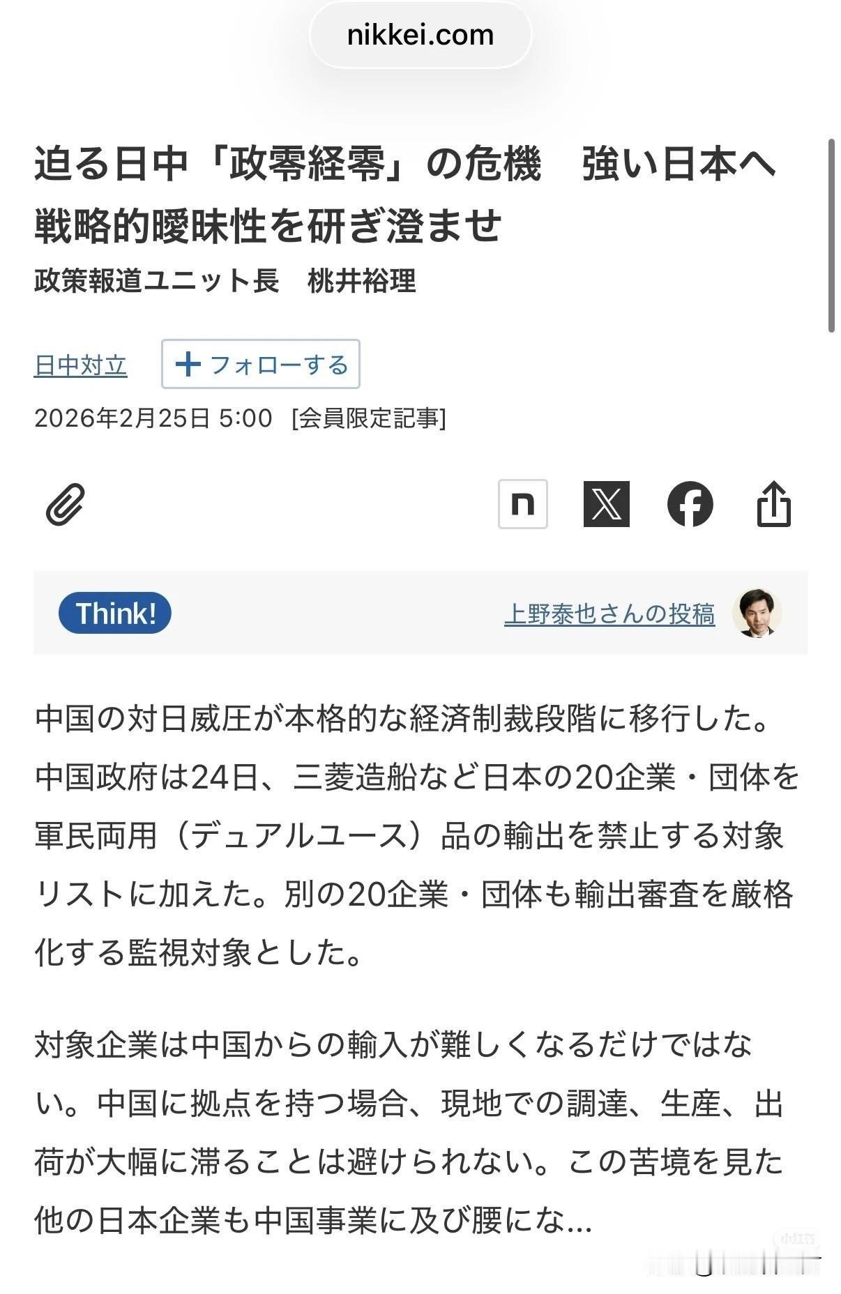 【日本自民党本部今天一大早就召开安全保障调查会会议】 日本众议院议员関芳弘发的帖子(就是面对镜头的这位),说今天的工作从安全保障调查会的会议开始,会议议题主要包括中国实施的出口管制等问题。今日的《日经》也说“日中”“政零经零”危机迫近。