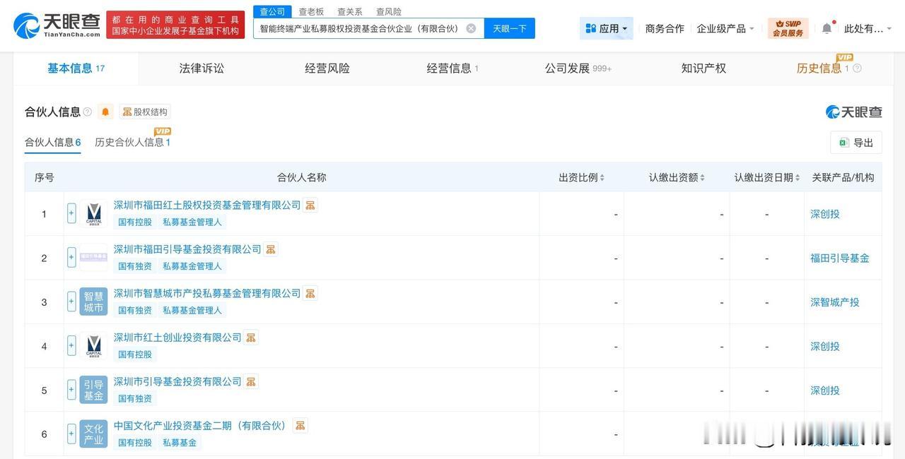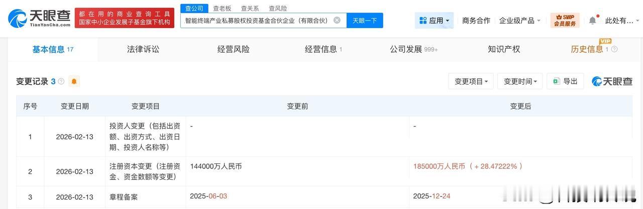 【深圳市人工智能终端产业私募基金增资至18.5亿 增幅约28%】 天眼查App显示,近日,深圳市人工智能终端产业私募股权投资基金合伙企业(有限合伙)发生工商变更,出资额由14.4亿人民币增资至18.5亿人民币,增幅约28%。 该基金成立于2025年6月,执行事务合伙人为深圳市福田红土股权投资基金管理有限公司,经营范围为以私募基金从事股权投资、投资管理、资产管理等活动。合伙人信息显示,该基金由深圳市福田红土股权投资基金管理有限公司、深圳市福田引导基金投资有限公司、深圳市智慧城市产投私募基金管理有限公司等共同出资。 天眼查信息: