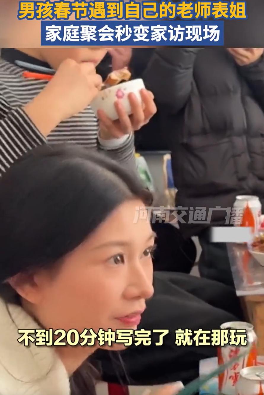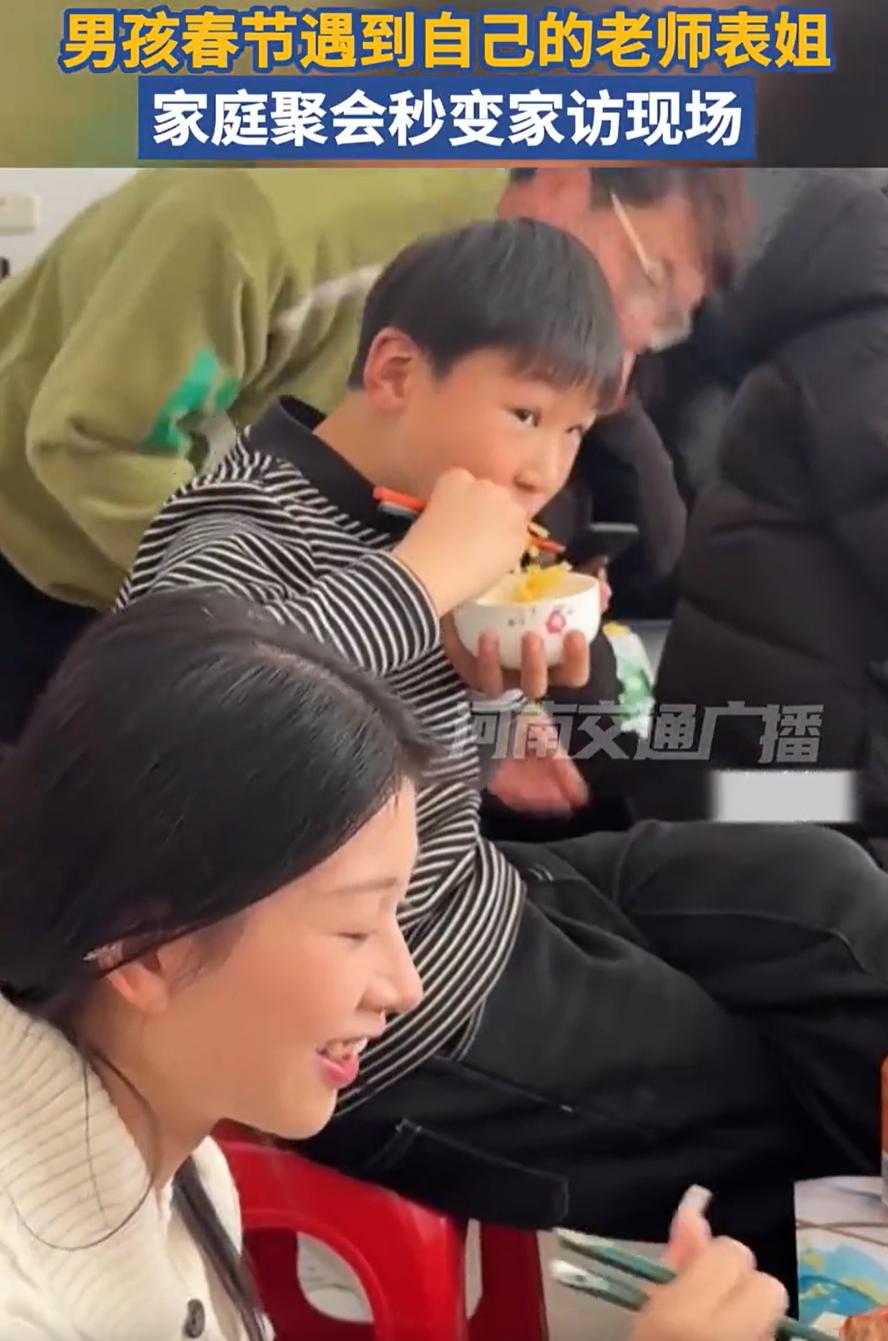这下天塌了!安徽淮安,男孩跟着父母去参加家庭聚会,本来还高高兴兴的,结果发现身为自己小学老师的表姐也来了,家庭聚会瞬间变成了家访现场,男孩在学校的老底全部揭露出来,而男孩脸上的笑容也转移到了别人的身上 一开始,男孩来的时候还是蹦蹦跳跳的,可到了楼梯拐角,看到表姐后男孩当场愣在那儿,脸上的笑容肉眼可见地凝固了 前一秒还欢天喜地,下一秒只想掉头走人。表姐倒是先开口了,来了一句:怎么,在学校喊我姐,到了家里就开始叫老师了? 进了屋,气氛就不太对了。原本该是热热闹闹的饭局,结果因为表姐在场,这顿饭愣是吃出了家长会的味儿。亲戚们围坐一桌,话题自然就绕到了孩子身上。表姐也不藏着掖着,直接把他在学校的表现抖了个干净 说这孩子考语文,二十分钟不到就交卷;考数学,十分钟写完就开始发呆;考英语也一样,写完就在那儿玩。总之就是,写得快,玩得欢,至于对不对,那得另说 这些话一出,满桌亲戚的目光全落在他身上。有的笑,有的问,有的开始拿自家孩子比较。男孩全程埋头扒饭,恨不得把脸埋进碗里 仔细想想,这种情况其实挺常见的。家里有个当老师的亲戚,对孩子来说,既是福气也是压力。福气在于学习上有人盯着,遇到问题能及时解决;压力在于,你的一举一动,随时可能被同步到家长那里。平时在学校表现好还行,要是有点什么小动作,那真是无处遁形 从这个角度看,这孩子的心情完全可以理解。本来家庭聚会是个放松的地方,结果因为表姐在场,整个氛围都变了。他不敢大声说话,不敢随便玩,连吃饭都得端着。那种感觉,大概就像上班摸鱼被领导撞见,还是在下班后的饭局上 男孩表姐是其老师 春节聚会变家访