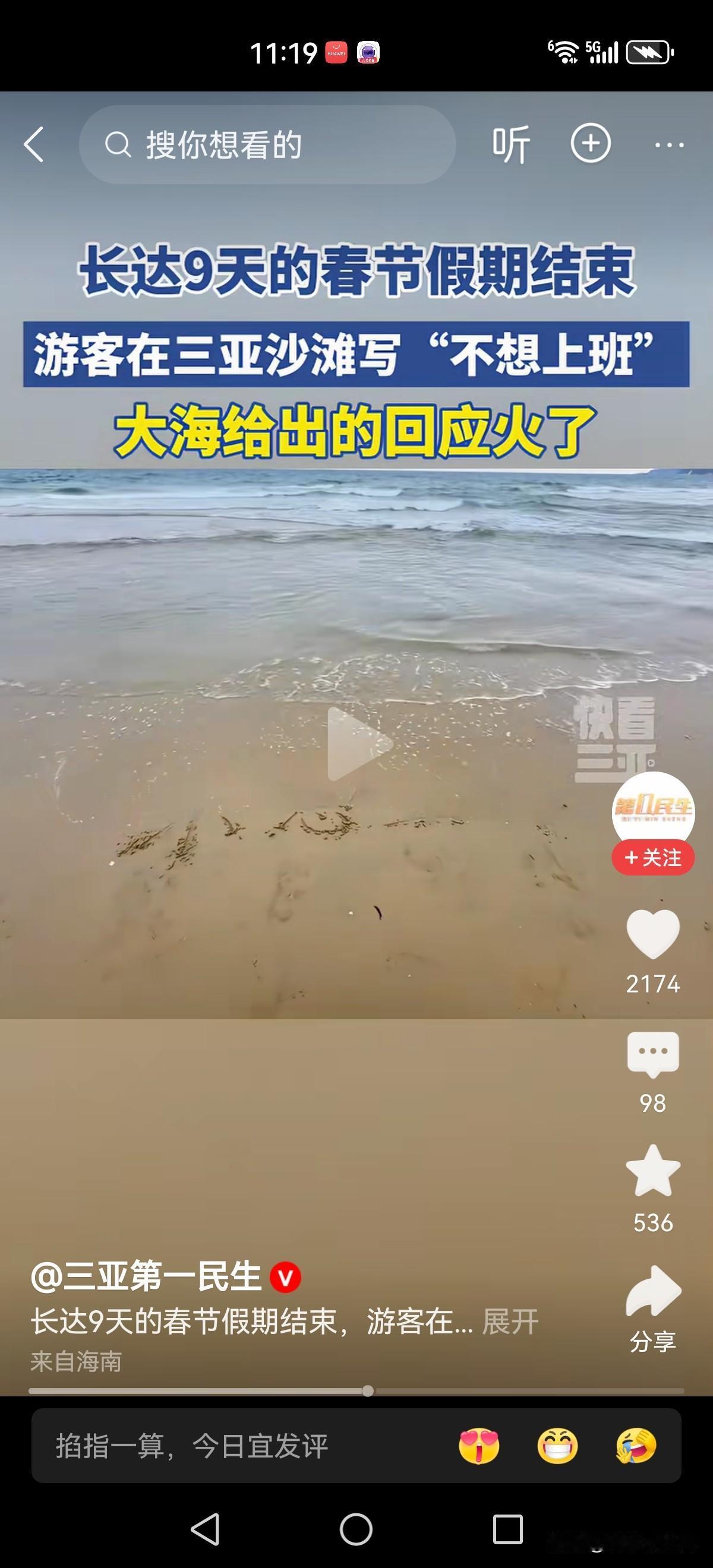 春节假期结束之际,游客在三亚海滩上直抒胸臆:不想上班。 没想到大海给出了它的回答:小心(没班上)!三亚旅游 海滩度假美景 我在三亚旅游 海滩度假照 三亚度假美照 三亚寒假游 海滩旅游