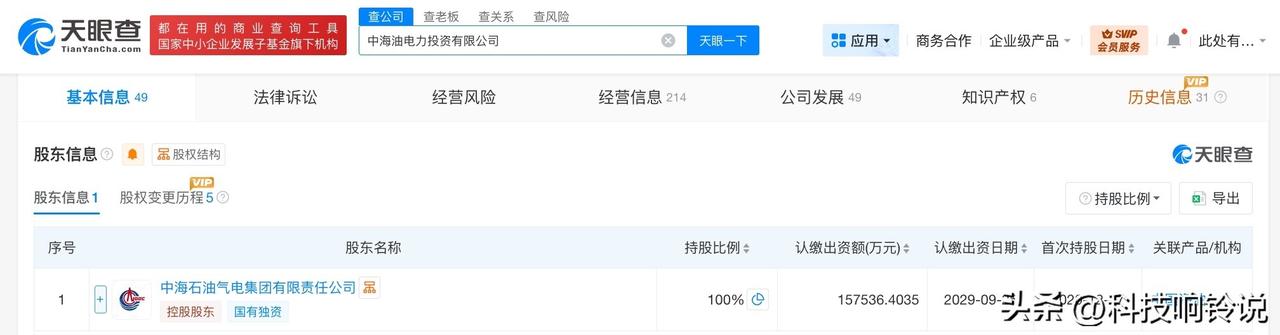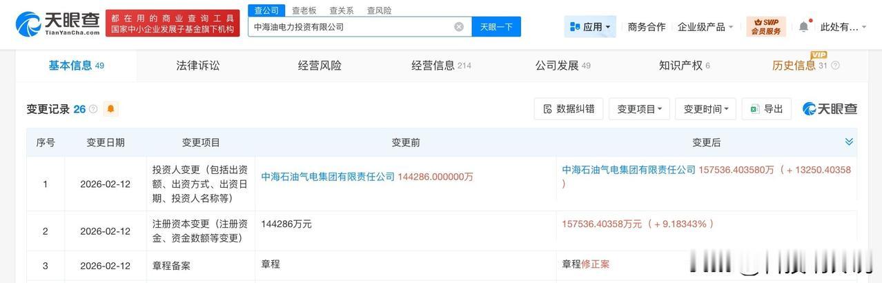 【中海油电力投资公司增资至15.8亿 增幅约9%】 天眼查App显示,近日,中海油电力投资有限公司发生工商变更,注册资本由约14.4亿人民币增至约15.8亿人民币,增幅约9%。 该公司成立于2020年12月,法定代表人为刘卫华,经营范围含以自有资金从事投资活动、发电技术服务、节能管理服务、电气设备修理、集中式快速充电站等。股东信息显示,该公司由中海石油气电集团有限责任公司全资持股。 天眼查信息: