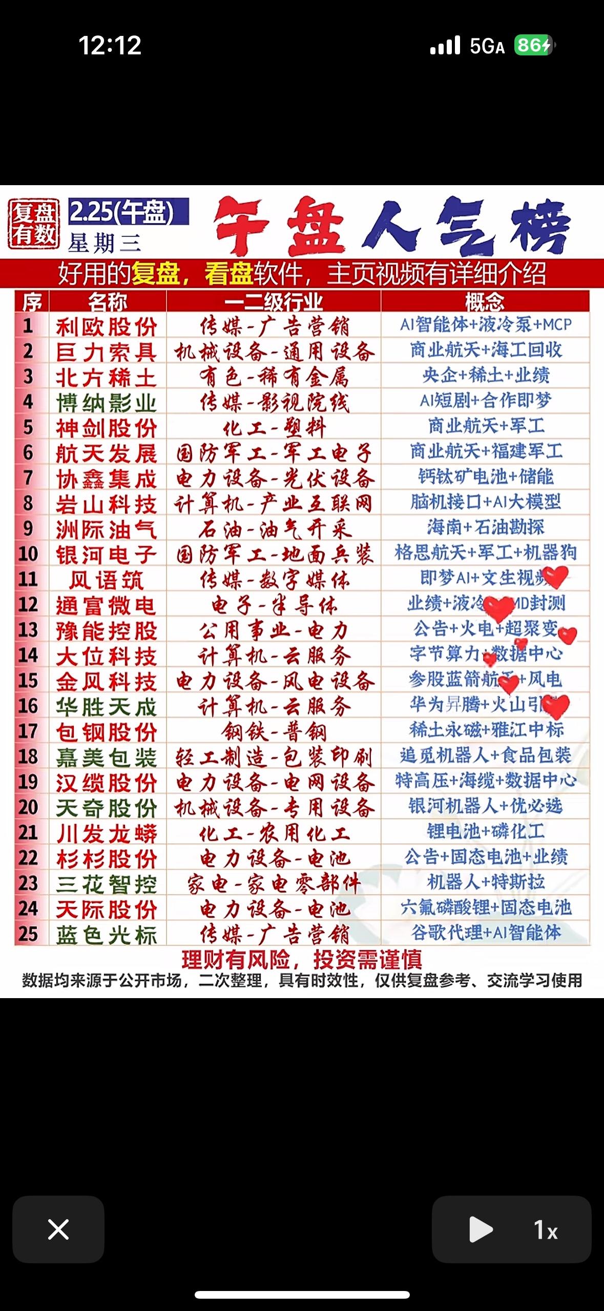 2月25日午盘人气榜揭晓,来看看有哪些热门股票。A股市场里,中际旭创2.24主力资金净流入21.4亿居首,北向资金也加仓,光模块是AI算力核心,今日量能配合好,明日科技线回流或带动其走高。山东墨龙2.24涨停,主力净流入5.3亿,虽隔夜原油小回调但地缘支撑在,有望延续涨停溢价。 热门人气股前瞻也有看点。山子高科走势健康,沿5日线主升;利欧股份震荡中低点抬高,有资金吸筹;协鑫集成封板死,抛压小,明天大概率高溢价;天奇股份尾盘抢筹,结合赛道后续或加速;铜陵有色图形走出来,均线多头排列,值得关注。