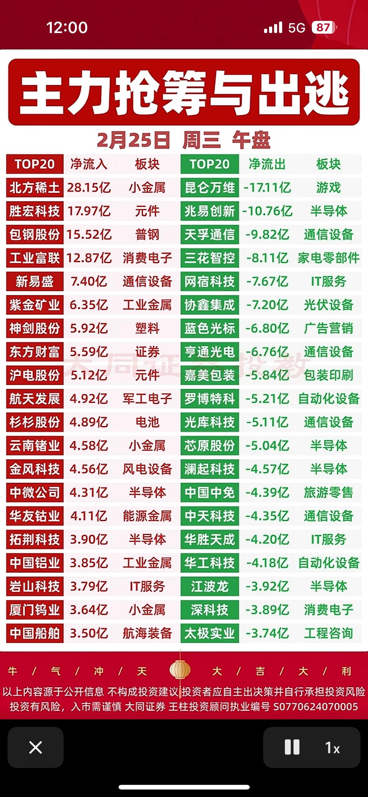 2月25日午盘,主力资金的抢筹与出逃情况很值得说道。开盘45分钟,主力资金呈现“高低切换”,大举涌入顺周期核心资产。像北方稀土、包钢股份等稀土永磁龙头,因供需格局优化和涨价预期,成抢筹主线,涨停板巨额封单很是坚决。胜宏科技、神剑股份等AI算力硬件股,也因业绩兑现确定性受青睐。紫金矿业等贵金属股因避险属性被关注。 而开盘40分钟,主力资金流出不少板块。如短期情绪过热的人工智能应用端、短剧与传媒概念等。消费电子产业链、传统制造业、医药生物部分领域也有资金流出。这背后是估值回归压力和市场风险偏好下降。投资者得看清主力资金动向,把握行情。