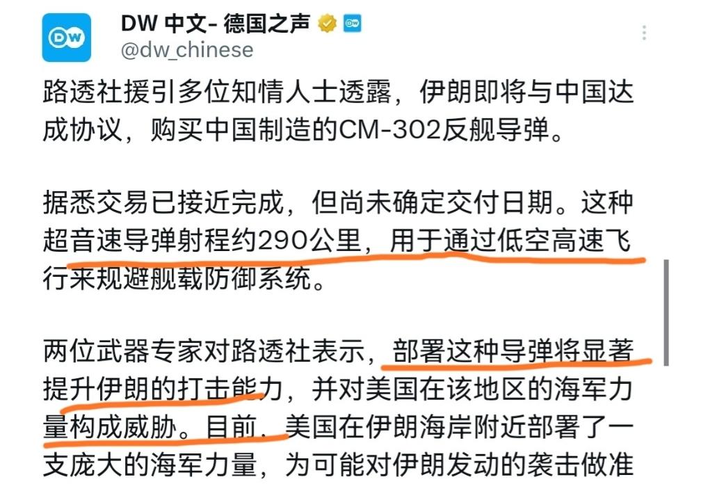 美国倒吸一口冷气!外媒表示,中国大杀器将售卖给伊朗,德媒称,这对于美国海上力量构成重大挑战!就在美国在中东集结军力之际,外媒突然曝光了一个大消息。2月24日,透社援引多位知情人士透露称,伊朗即将与中国达成协议,购买中国制造的CM-302反舰导弹。两位武器专家对路透社表示,部署这种导弹将显著提升伊朗的打击能力,并对美国在该地区的海军力量构成威胁。 有那么几位消息灵通的人士向外界透露,伊朗正在和咱们中国敲定一笔大单,要买的是什么呢?正是大名鼎鼎的CM-302超音速反舰导弹。 你想想,美军两个航母战斗群正堵在人家门口耀武扬威,这时候传出这个消息,意味着这已经不是简单的军火交易,这简直就是往本已滚烫的油锅里,又狠狠浇上了一瓢凉水。 这个CM-302到底是个什么狠角色,能让西方的军事专家们集体倒吸一口凉气,这是咱们国家“鹰击-12”反舰导弹的出口版本,江湖人送外号“航母杀手锏”。 它最厉害的地方,就俩字——快,而且是全程超音速的快,它的飞行速度能超过三倍音速,射程接近三百公里。 你这边的预警雷达屏幕上刚闪过一个光点,还没等反应过来要怎么拦截,它可能就已经快砸到你脸上了。 它不是傻乎乎地从高空飞过来让你打,它是贴着海面几米高的高度进行超音速突防,就像一个高速掠过的海上幽灵。 这让当今世界上最先进的舰载防空系统,比如美国的“宙斯盾”,都感到非常头疼。 一位以色列的前情报高官就直说,如果伊朗真拿到了这种武器,那整个地区的军事游戏规则就得重写,因为它太快、太刁钻,想拦住它实在是太难。 再加上它那超过250公斤的战斗部,挨上一发,万吨级的驱逐舰就算不当场沉没,也得瞬间失去战斗力,变成一堆漂在海上的废铁。 伊朗这些年一直在琢磨怎么在自己的地盘上,跟实力远超自己的对手掰手腕,这就是所谓的“非对称作战”,他们的核心战略,就是牢牢控制住霍尔木兹海峡这个全球能源的咽喉要道。 他们搞无人机“蜂群”战术,在海岸线上秘密部署了各种导弹,把整个海峡打造成一个巨大的口袋阵,谁敢硬闯就得做好掉层皮的准备。 虽然他们手里已经有了一些反舰导弹,但总感觉差点火候,缺一个能一锤定音的杀手锏。 现在,CM-302的出现,正好把这最关键的一块短板给补上了,它给伊朗苦心经营的“反介入/区域拒止”战略,装上了一颗最锋利、最致命的獠牙。 从此以后,任何想在波斯湾里自由航行的水面舰艇,都必须掂量一下自己能不能躲过这来自海平线下的致命一击。 咱们中国在尖端武器装备这个领域,是真的站起来,而且站得很稳。 从过去射程覆盖第二岛链,让航母不敢轻易靠近的东风系列“航母快递”,到如今可以在国际市场上公开销售,性能让世界顶尖水平都侧目的CM-302,我们手里这张反制海上霸权的牌,是越来越全,越来越硬气。 这种技术实力,不仅是保卫我们自己的定海神针,也成了影响世界格局的一个重要变量。 美国费尽心思想在国际上孤立伊朗,把它彻底摁死,这一下就变得更加困难,说白了,从我们的战略利益出发,一个稳定且不完全倒向西方的中东,对我们的能源安全至关重要。 在地缘博弈的棋盘上,多一个能够有效牵制对手的朋友,总归不是坏事。 你认为面对这种全新的战略态势,那些此刻还停在波斯湾的钢铁巨兽,还能睡得安稳吗? 个人观点,仅供参考!