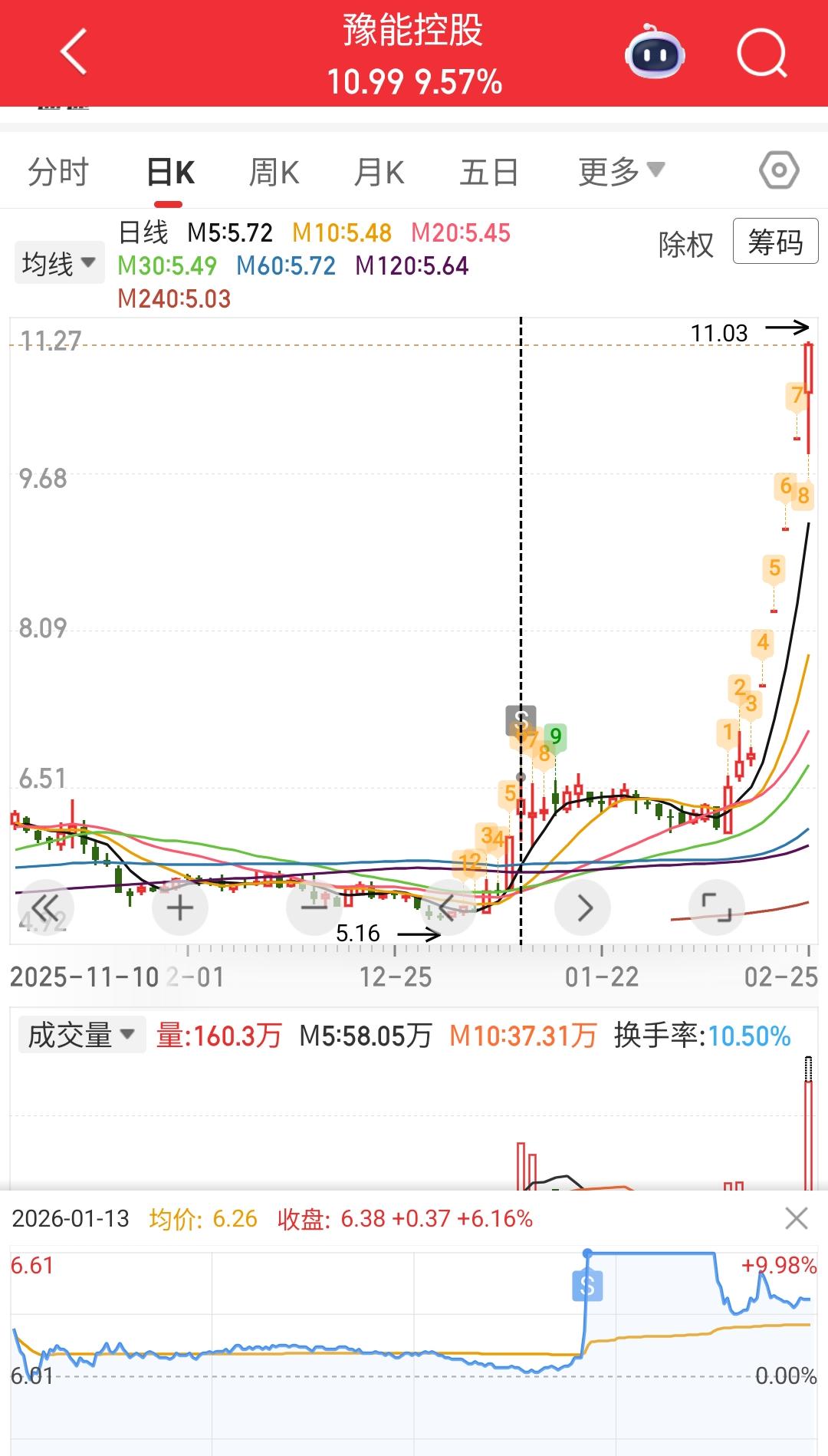 豫能控股,目前市场最高标,成功实现5连板,怎一个郁闷了得? 长线真的是比短线难多了! 去年7月初,第二波炒电力的时候追的,当时赚了没走,之后两个多月最低被打到5.03,浮亏20%左右,后面偶尔补仓做了几次T,一直熬到了10月28号6.56,再次赚了大几千,当天虽然不是大涨,也是收了个光头强,看着趋势还不错,还是没出,当时想着已经熬了3个多月了,再赚5个点再看情况出吧,当天盘后还有利好消息,结果第二天早盘差一点跌停,再次被套。 继续熬,越熬越低,直到今年1月5号再次被打到5.16,当时已经不想再看它了,每天波动一点点,当时浮亏已经超过10个W,怎一个郁闷了得! 当时全市场注意力都在商业航天和Ai方向,煤电根本没人关注,结果一周后,1月12号无意间就上板了,1月13号再次连板,当时最高价是6.61。至此已经是第三次赚钱,也已经熬了六个半月了,实在熬不住了,一上板就有大单不断出货,我当时也出掉了,果不其然,不到一个小时就开板了。 后面就是连续17个交易日的小幅震荡回调,当时还计划,要是再回到5.2之下,就全部接回,可17个交易日后最低只回到6.04,其实离出的点位已经跌去近10个点了。2月6号低开高走,当天收涨6.72%,隔了个周末,星期一又是冲高回落,当时又不敢进了。 之后就没有然后了,利好消息一出来,就是连了4个一字板,想再买都买不进,今天是第五个板了,目前也是市场上最高连板。 做中长线,进场位置把握不好,晃悠半年,看着账户一次次赚钱又一次次被深套,折腾两三波之后,只要还是天天看它,怎么都拿不住,除非一直别管别看,什么时候看账户浮赢已经百分之六七十了,再来重点关注它,只有这样才能拿的住长线。 以上绝非荐股,只是记录一下长线做失败的案例,顺便再总结一下失败的经验教训。