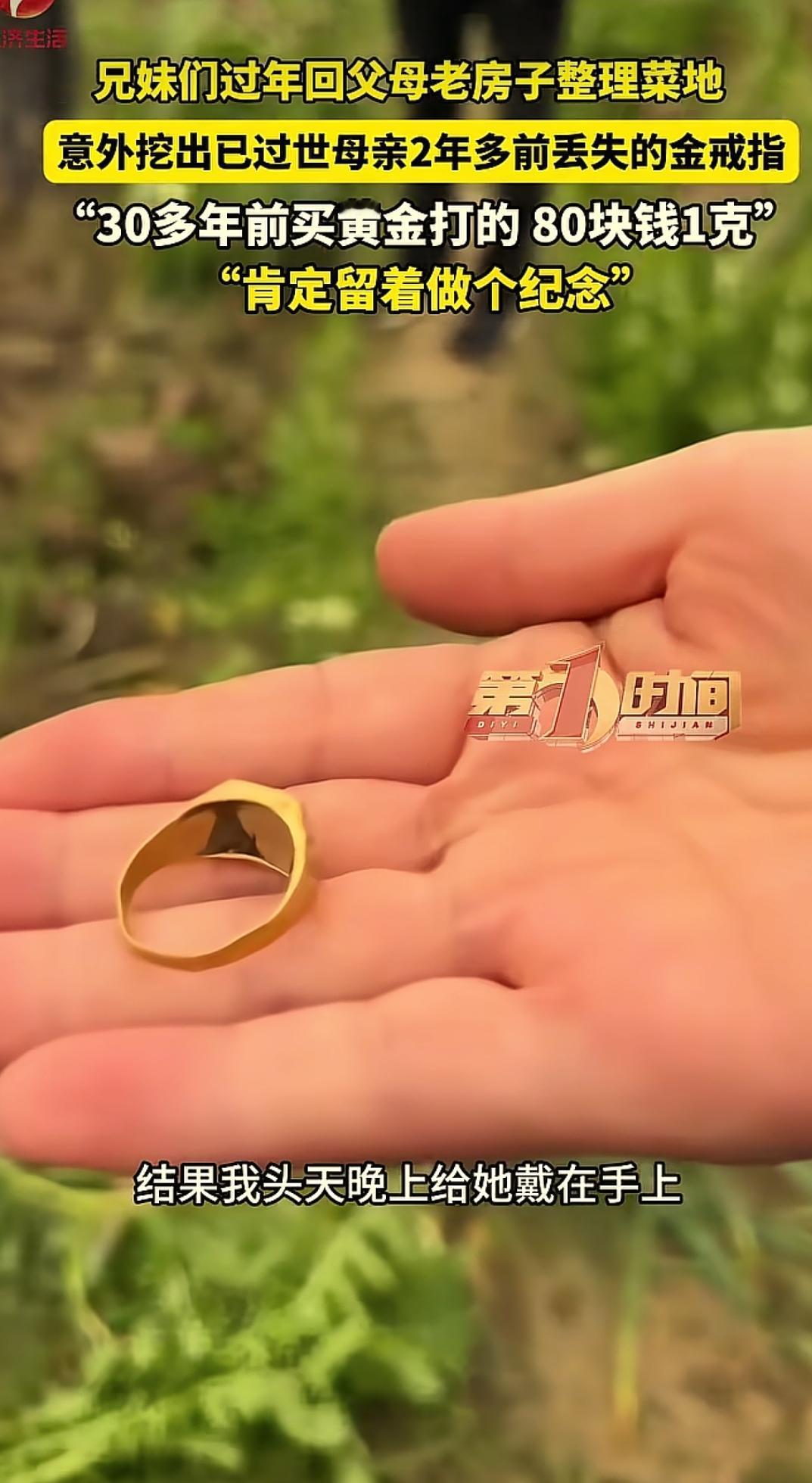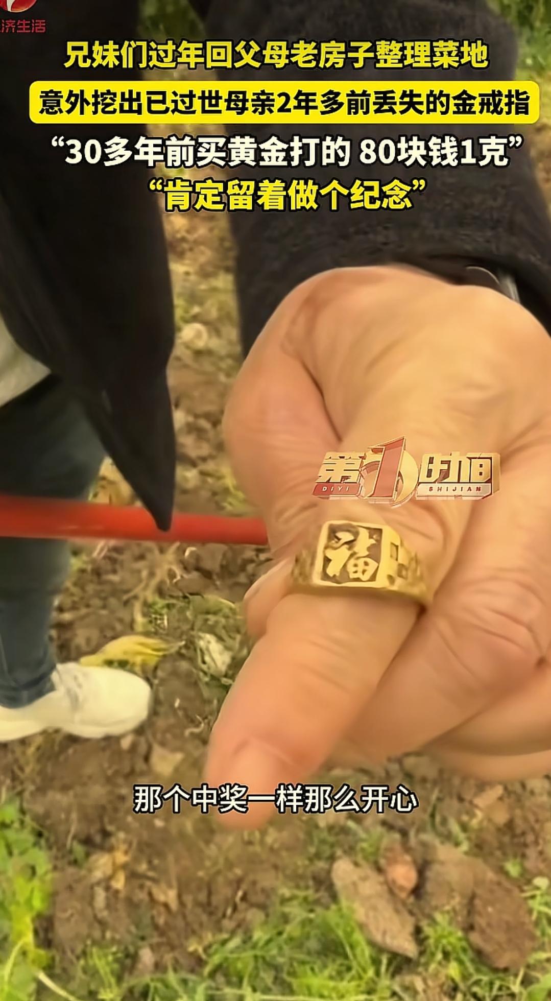 这简直是意外之财!四川内江,女子回老家的房子过年,在整理菜地时,突然发现地里有个亮闪闪的东西,拿起一看竟然是过世母亲2年前丢失的金戒指,当时一家人找了好久,没想到这次却意外翻了出来,女子感叹:比中了大奖还要开心 刘女士趁着过年回了趟老家。家里老人不在了,房子空了大半年,她想着趁着过节回来收拾收拾,扫扫尘,翻翻地 农村的院子边上有一小片菜地,当天,刘女士拿着锄头随便刨了两下,想着开春了种点小菜。结果一锄头下去,土里竟然有个东西闪了一下 她蹲下来用手一扒,一枚金戒指露了出来。黄澄澄的,沾着泥土,但一眼就能认出来,这是她妈戴了三十多年的那枚戒指 说起来这枚戒指不是什么时髦的款式,样式老气,甚至有点土,是那种八十年代流行的老金。但它的分量不在克数上。三十多年前,金价一克八十块,刘女士带着父母去金店挑的,后来按母亲的手型打了个戒指。老太太戴了一辈子,从年轻戴到白头,手上的皮肤都磨出了茧子 两年前,母亲病重。有天晚上,她突然把戒指摘下来,硬要往刘女士手里塞,说我这个病怕是过不去了,这东西你留着。刘女士当时眼泪就下来了,死活不肯接,又把戒指给母亲戴了回去,说您别瞎想,病一定能好 第二天一早,戒指就不见了 全家人在屋里屋外找了个遍,床底下、衣柜缝、院子里,翻来覆去找了好几遍,愣是没见着影。隔天母亲走了,这枚戒指就成了刘女士心里一个疙瘩 她总觉得,要是当时顺着母亲的意思把戒指收下,是不是就不会丢?母亲临走前,手指上空空的,她一想起来就难受 谁能想到,两年后,这戒指自己从土里冒出来了 这事儿发到网上,评论区好多人看哭了。有人说,这是老太太自己把戒指藏起来的,怕女儿不收,又怕她将来找不着,就埋在了最熟悉的菜地里,等着女儿哪天翻地的时候自己发现 也有人说,这东西不是找到的,是母亲两年后亲手还给她的 有时候缘分这事儿说不清楚。东西丢了就是丢了,找不回来也是常态。但有些东西,兜兜转转还是会回到你手里。不是因为它值多少钱,是因为它身上带着人的念想,丢不了,也断不掉