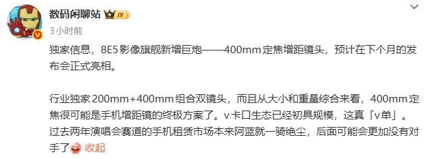 400mm定焦增距镜头蓝厂卷影像是真真真真真真努力呀,以后追星看演唱会人手一个vivo够够的了
