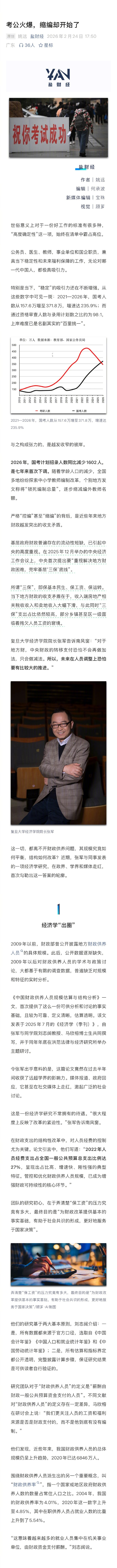 #考公是就业最优解吗#【#考公火爆缩编却开始了#】世俗意义上对于一份好工作的标准有很多种,“高度确定性”这一项,始终在清单中霸占高位。公务员、医生、教师,事业单位和国企职员,兼具当下稳定性和未来福利保障的工作,无论对哪一代中国人,都极具吸引力。特别是当下,“稳定”的吸引力还在不断增强。从这些数字中可见一斑:2021—2026年,国考人数从157.6万增至371.8万,增速达235.9%;而通过资格审查人数与录用计划数之比约为98∶1,上岸难度已是名副其实的“百里挑一”。与之构成张力的,是越发收窄的彼岸。2026年,国考计划招录人数同比减少1602人,是七年来首次下调。随着学龄人口的减少,全国多地纷纷探索中小学教师编制改革,个别地方发文称将“锁死编制总量”,逐步缩减编外教师名额。严格“控编”甚至“缩编”的背后,是近些年来地方财政越发突出的收支矛盾。基层政府财政普遍存在的流动性短缺,已引起中央的高度重视。在2025年12月举办的中央经济工作会议上,中央首次提出要“重视解决地方财政困难,兜牢基层‘三保’底线”。所谓“三保”,即保基本民生、保工资、保运转。当下地方财政的收支矛盾在于,收入端房地产相关税收收入和卖地收入大幅下滑,与此同时“三保”支出占比依然较高,部分乡镇甚至区一级面临着拖欠人员工资的窘境。(南风窗)