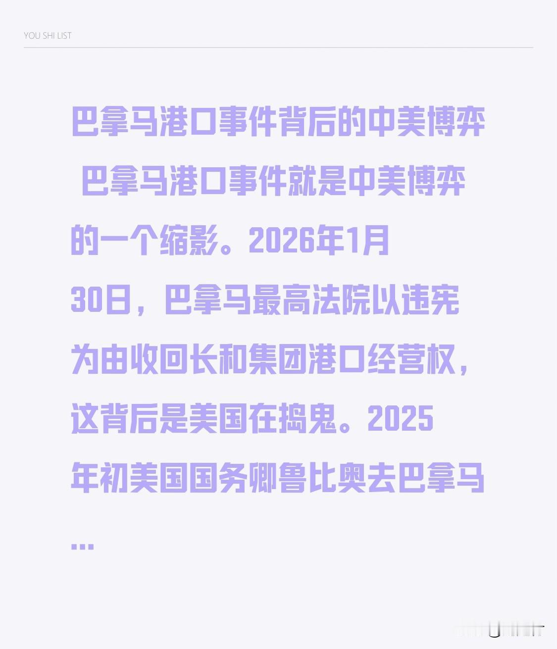 巴拿马港口事件背后的中美博弈 巴拿马港口事件:中美博弈的缩影 2026年1月30日,巴拿马最高法院以违宪为由,收回长和集团港口经营权,背后是美国在暗中操纵。2025年初,美国国务卿鲁比奥前往巴拿马施压,此后长和集团便遭到各种审查。巴拿马此举,一是想快速获利、兑现竞选承诺,二是扛不住美国压力。 今年3月,美国财团拟出资228亿美元收购长和旗下位于巴拿马运河咽喉位置的港口。我国官方介入后,长和套现失败,交易陷入僵局。如今我国要求中远海运集团获得控股权,白宫称“不可接受”。这体现了我国在供应链安全问题上绝不妥协的态度,美资独控会威胁国家能源与供应链安全,必须坚守底线。