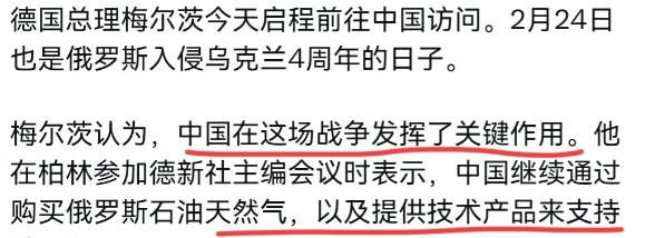 德国总理默茨再次对我们施压!当地时间2月24日,默茨在柏林机场发表讲话时明确表态,中国在俄乌这场冲突中发挥着关键作用。 他还具体提及,中国一直在通过购买俄罗斯的石油和天然气,再加上提供技术产品的方式,对俄罗斯予以支持。 默茨甚至说出了一段十分不切实际的话,他认为只要中国明天告诉普京停手,普京后天就必须停下军事行动。 紧接着他又放缓语气,称自己只是想努力了解中国。他表示反过来也想向中方解释自己的立场,包括他个人在德国和欧洲的立场、对当下全球形势的看法,以及双方未来可能共同努力的方向。 默茨反复强调,他希望中德双方能够开展一场坦诚的讨论。明眼人都能看出来,这番看似温和的讲话,核心还是在对中国施压,所谓中国发挥关键作用的说法,本质就是想让中国改变当前的中立立场。 当然,尽管德国的想法显得格外不切实际,甚至高估了中国在俄乌冲突中的影响力,但默茨的表态里,也能看出德国政府的克制态度。 他没有像美国那样直接指责中国“支持俄罗斯”,反而反复提及“坦诚讨论”和“了解中国”,这背后全是德国的现实考量。 默茨此次访华带着庞大的商业代表团,随行的有拜耳、大众、西门子等30多位德国头部企业高管,这是自默克尔时代以来规格最高的访华商团。 德方很清楚,中国是德国最大的贸易伙伴,2025年两国贸易总额达到2518亿欧元,德国经济根本离不开中国市场。 他不敢把话说得太绝,更不敢彻底得罪中国,毕竟德国企业在华有着巨大利益,93%的受访德企都无意在未来两年撤出中国,还有一半以上计划增加在华投资。这种情况下,所谓的“施压”更像是一种谈判前的试探。 再者,默茨政府也面临着来自欧洲内部和美国的压力。美国一直施压欧洲国家对华强硬,要求欧洲跟随自己的步伐制衡中国,而欧洲内部也有部分势力希望中国能介入俄乌冲突、推动停火。 默茨的这番表态,既是做给美国和欧洲内部看,展现自己“不软弱”的立场,也是想在访华前掌握一定主动权,为后续的谈判增加筹码。他心里清楚,中国不可能真的一句话就让俄乌冲突结束。 中国在俄乌冲突中的立场一直一以贯之,始终站在和平一边,坚持劝和促谈,推动危机通过政治途径解决。 中国购买俄罗斯的石油天然气,完全是基于双方的正常经贸合作,遵循市场规律,这一点无可厚非。 默茨的施压看似强硬,实则底气不足。德国当下经济复苏乏力,又受美国关税政策影响,对华合作已经成为德国经济摆脱困境的重要出路。他既要兼顾盟友诉求,又要维护本国利益,只能在施压和克制之间寻找平衡。 此次访华,默茨的核心目的还是寻求中德合作的平衡点,而非真的要与中国对抗。这番考前施压,终究只是德国的一场小心思,改变不了中德互利共赢的大趋势,更动摇不了中国坚持中立、劝和促谈的坚定立场。