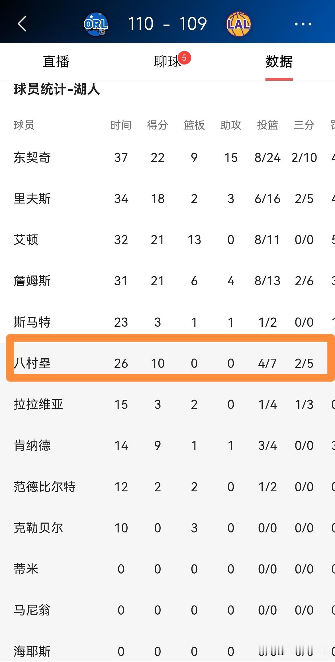 湖人大将八村塁真是太讨厌抢篮板了!在今天湖人主场以109:110惜败于魔术的比赛中,八村塁作为一名四号位球员竟然零篮板,真是让人大吃一惊。 整场比赛下来,八村塁替补出战26分钟,投篮7中4,其中三分球5中2得到10分0篮板0助攻,他的场上正负值为-3。 值得一提的是,这已经是八村塁在本赛季第二次出现零篮板的情况了,由此可见八村塁是多么的讨厌抢篮板。