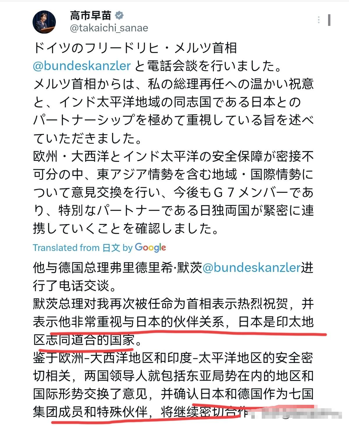 德国算盘打的是真精!中国刚对日本进行反制,德国总理动身访华当天,默茨卡点与高市早苗进行通话。而在德日两国领导人通话之后,2月24日,高市早苗表示,我与德国总理弗里德里希·默茨进行了电话会谈。默茨总理就我再次就任首相表示热烈祝贺,并表示,高度重视日本作为德国在印太地区的志同道合伙伴国之间的合作关系。 德日两国同意,当前,欧洲、大西洋地区与印太地区的安全保障密不可分。双方就包括东亚局势在内的地区及国际形势交换了意见,并确认:作为G7成员国与特殊伙伴,日德两国今后将继续紧密协作。 默茨这通电话说得比唱的好听,又是祝贺高市早苗再次就任首相,又是说高度重视日本这个“志同道合的伙伴”,还跟日本敲定了要在安全保障上紧密协作,说什么欧洲和印太的安全密不可分。 这话听着冠冕堂皇,其实骨子里全是算计。德国心里比谁都清楚,中国是他们在欧洲之外最重要的贸易伙伴,这些年中德贸易额一直保持在2000亿美元以上,双向投资存量超过650亿美元,德国的汽车、化工、机械制造这些优势产业,离了中国市场根本玩不转。 这次默茨带着30家头部企业的高管访华,就是奔着赚钱来的,想抓住中国对外开放的机遇,在清洁能源、工业数字化这些新兴领域再捞一笔。 可他们又不敢得罪日本,毕竟都是G7成员国,在遏制地区发展、围堵新兴力量这事儿上,两国有着共同的阴暗心思,德国还想借着日本把自己的影响力伸进印太地区,平衡中国和俄罗斯的存在感。 所以默茨才搞出这么一出“通话访华两不误”的戏码,一边给日本递橄榄枝,稳住这个“特殊伙伴”,让日本知道德国不会因为要和中国合作就疏远他们,两边的安全协作该推进还得推进;另一边又带着庞大的经贸代表团来中国,想继续从中国市场捞好处,享受着和中国合作的红利。 这种两头下注的操作,看着精明,其实特别不地道,把功利主义那一套玩得明明白白。他们嘴上说着要和中国深化务实合作,心里却打着和日本勾结、干涉地区事务的小算盘,以为这样就能左右逢源,既赚得盆满钵满,又能实现自己的地缘政治野心,也太把别人当傻子了。 最让人不齿的是,德国明明想从中国这里捞经济好处,却又不敢公开和日本切割,反而在敏感时刻和日本眉来眼去,这种骑墙派的做法,根本不是一个大国该有的担当。 中德建交五十多年,合作的基础是相互尊重、互利共赢,可德国现在的所作所为,明显是把政治算计凌驾于合作诚意之上。 他们既想保住中国这个大市场,享受中国发展带来的机遇,又想跟着日本搞小圈子,干涉地区事务,遏制中国的发展,天下哪有这么好的事情? 这种两面三刀的操作,只会让大家看清德国的真实面目,所谓的“务实合作”不过是他们牟取利益的幌子,一旦涉及到地缘政治博弈,他们还是会毫不犹豫地站到中国的对立面。 日本这边更是打得一手烂牌,明明自己的军工产业链高度依赖中国,重稀土几乎100%靠中国供应,镓、锗等关键材料90%以上从中国进口,却还敢到处挑衅,搞军事扩张。 中国这次的反制措施可以说是精准打在他们的七寸上,直接断了20家核心军工企业的供应链,再想研发进攻性武器、搞军事部署,恐怕没那么容易了。 可就在这个时候,高市早苗还高调宣布和默茨通话,强调日德紧密协作,无非就是想给自己壮胆,告诉外界还有德国这个靠山,想借此抵消中国反制带来的压力。 但这种表面上的抱团,根本解决不了日本自身的问题,依赖别人的支持换不来真正的安全感,反而会让日本在错误的道路上越走越远,最终只会搬起石头砸自己的脚。 说到底,德日这种卡点通话、紧密协作的行为,本质上就是地缘政治博弈中的利益勾结,他们想通过抱团的方式,在全球格局中抢占更多优势,遏制新兴力量的发展,维护自己的既得利益。 但他们忘了,时代早就变了,现在的世界讲究的是互利共赢、和平发展,搞小圈子、拉帮结派、挑起对抗,根本不符合历史潮流,也得不到国际社会的支持。 德国想两边讨好、两头获利的算盘,终究是要落空的,因为合作的基础是真诚,不是算计,一旦失去了信任,再紧密的贸易关系也会出现裂痕。 而日本抱着军国主义的旧梦不放,拉着别人搞军事对抗,最终只会付出惨痛的代价,地区稳定不是靠挑衅和勾结就能破坏的,中国维护自身安全和地区和平的决心,从来没有动摇过。 现在的国际形势虽然复杂,但正义和公道自在人心,搞阴谋诡计、拉帮结派的势力终究站不住脚。中国对日本的反制,是维护自身安全和地区稳定的正当之举,合法合理,无可指摘。 而德日之间的勾结,不管包装得多么好听,本质上都是为了各自的私利,破坏的是地区和平与稳定。我们早就看清了他们的真面目,也不会被他们的小动作所干扰,该合作的合作,该反制的反制,中国有足够的底气和实力,应对任何挑战和挑衅。德国的算盘打得再精,也改变不了时代发展的潮流,想在大国之间左右逢源、渔翁得利,最终只会聪明反被聪明误,落得个两边不讨好的下场。