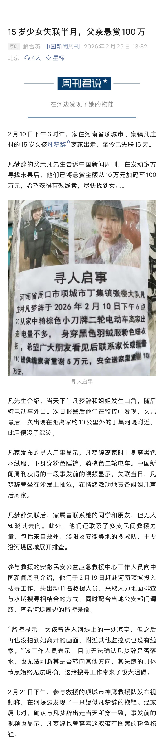 #悬赏100万寻失联女儿##凡梦辞你在哪#【#15岁少女失联半月父亲悬赏100万#】2月10日下午6时许,家住河南省项城市丁集镇凡庄村的15岁女孩凡梦辞离家出走,至今已失联15天。凡梦辞的父亲凡先生告诉,在发动多方寻找未果后,他们已将悬赏金额从10万元加码至100万元,希望获得有效线索,尽快找到女儿。