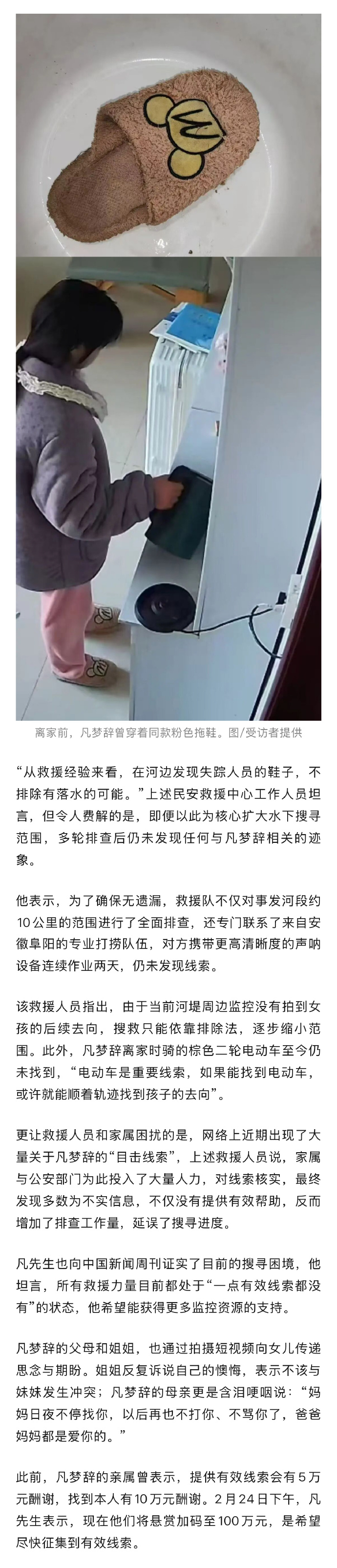 凡先生介绍,当天下午凡梦辞和姐姐发生口角,随后骑电动车外出。次日报警后他们在监控中发现,女儿最后一次出现在距离家约10公里外的丁集河堤附近,此后便没了踪迹。凡家发布的寻人启事显示,凡梦辞离家时上身穿黑色羽绒服,下身穿粉色睡裤,骑棕色二轮电车。获得的一段事发前的视频显示,失联当日,凡梦辞曾坐在沙发上抽泣,在情绪激动地责备姐姐几声后离家。