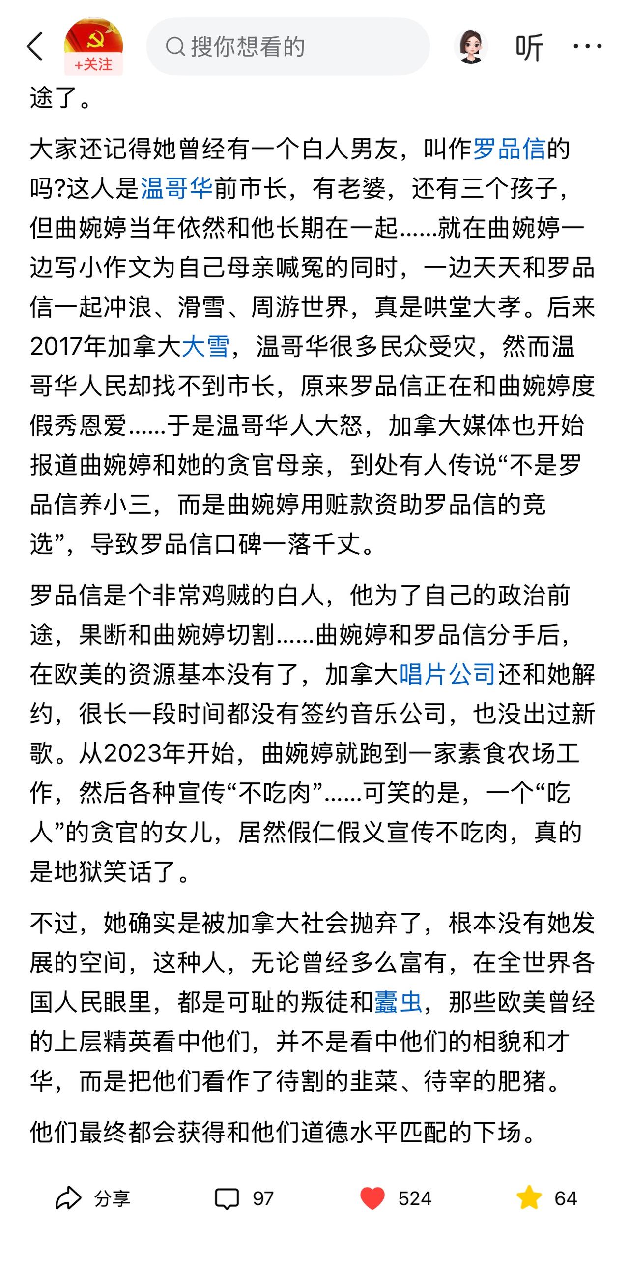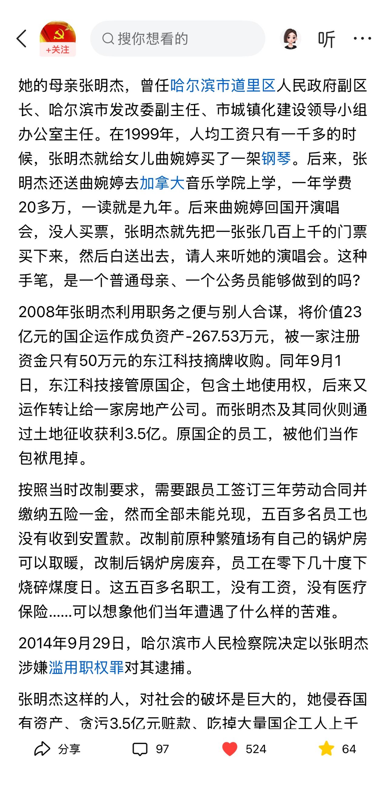 真是大快人心 曲婉婷开通账号不到24小时就被封禁了 大家不会忘记,因为她的母亲张明杰贪污3.5亿国有资产,500多名员工在零下几十度的寒冷冬天里,只能靠烧碎碳度日。 因为她母亲的一己私欲,这500多名员工没有工资,没有医保,生活都没了保障。 而那些年她靠着她母亲的赃款,在国外过起了奢靡的生活,甚至她还给温哥华市长当起了小三。 如今,白人男友把她抛弃了,她母亲剩下的钱又被挥霍完了,又想舔着脸来国内捞钱了,哪里有这样的好事? 如果这样的人都能复出的话,那这个世界就没有公道可言了。 对于失德艺人,就该全面抵制才对,大家说是不是