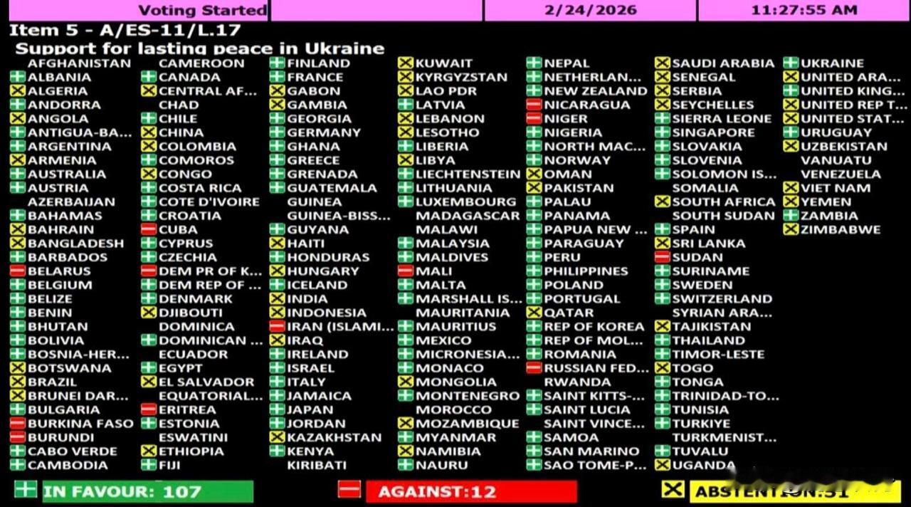 联合国《支持乌克兰持久和平》决议通过,美国反对 洲哥讲时事 当地时间2026年2月24日,联合国大会就乌克兰问题召开紧急特别会议续会,通过了题为《支持乌克兰持久和平》的决议。 美国提出的该程序性表决——即“分项表决动议”(要求对重申乌克兰主权及呼吁依据国际法实现全面和平的关键段落进行单独表决)时以69票反对、11票赞成、62票弃权被否决。 随后大会以107票赞成、12票反对、51票弃权(包括美国)的结果通过了《支持乌克兰持久和平》决议全文。 虽然美国代表团要求对两段内容单独表决,称若将其保留在决议主体中,将“干扰”当前美国主导的结束战争外交努力。美国强调欢迎《支持乌克兰持久和平》决议草案呼吁立即停火,但认为“决议中的某些措辞可能干扰正在进行的谈判,而非支持探讨可能为持久和平铺平道路的全方位外交途径”。 乌克兰代表团对此表示反对:“削弱或删除这些措辞将发出极其危险的信号,暗示这些基本原则可以被谈判改变”,呼吁各成员国否决美国提出的动议。 法国同样敦促各国代表团投票反对分段表决,警告称“不基于《联合国宪章》原则的和平既不公正也不持久”。 最终《支持乌克兰持久和平》决议案要求俄乌双方“立即全面无条件停火”,重申支持乌克兰在其国际公认边界内的主权、独立和领土完整。 决议同时呼吁交换战俘,并遣返包括儿童在内的被强制转移或驱逐的平民。 国际新闻实时报道:敬请关注今日头条号《智慧转身》 俄乌战争战场剖析:敬请关注抖音《洲哥讲时事》视频更精彩。 中国传统文化弘扬与传播,敬请关注《洲瑜国学讲堂》