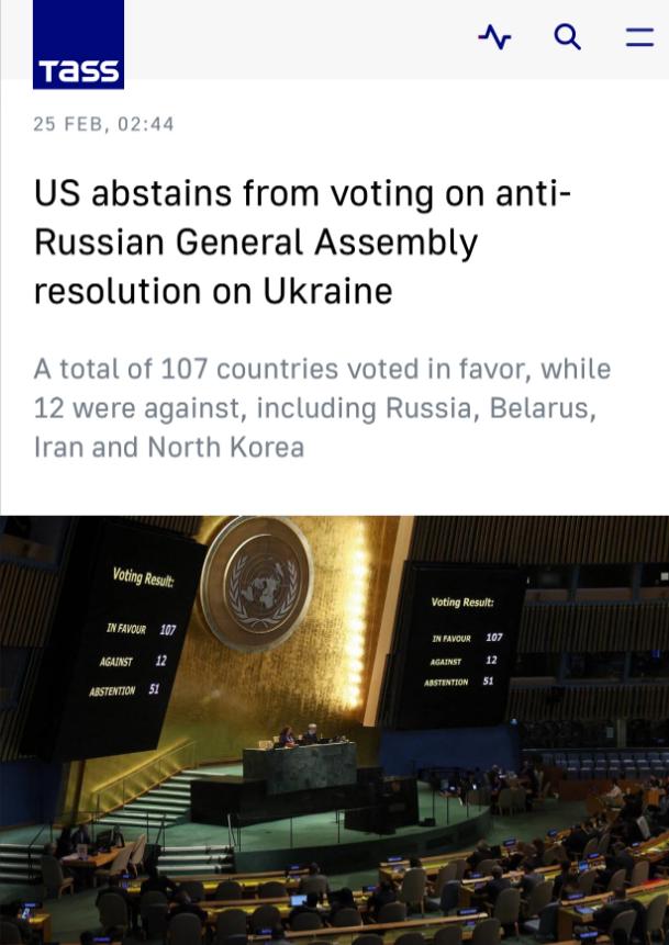 塔斯社:美国对联大反俄决议投了弃权票 塔斯社联合国 2 月 24 日电、2 月 25 日发布:美国在联合国大会上就基辅政府起草的关于乌克兰的反俄决议进行表决时投了弃权票。 这一幕放在几年前根本不敢想,过去每次联大涉乌投票,美国都是带头冲锋、拉着盟友全票赞成,这次直接掉头弃权,等于公开把乌克兰和欧洲盟友晾在一边。这场投票不是简单的立场变化,而是美国对乌政策彻底转向的信号,也是国际格局重新洗牌的直观体现。 本次联大投票结果十分清晰,乌克兰牵头的决议最终获得107 票赞成、12 票反对、51 票弃权,中国与美国同时选择弃权,俄罗斯等国投下反对票。从票数分布就能看出,支持乌克兰的阵营不再铁板一块,越来越多国家选择保持中立,不再盲目跟着西方选边站队。 美国弃权的原因并不复杂,这份由基辅起草的决议,立场过于偏向单方,只强调乌克兰提出的条件,完全忽视俄罗斯的合理安全关切,也没有为真正的和谈留出空间。美国代表团曾在会前提出拆分表决,希望对部分争议条款单独投票,结果被乌克兰方面拒绝,联大也否决了这一请求,美国干脆直接弃权,不再为这份极端文本背书。 更深层的原因,是美国对乌援助已经走到拐点。过去几年,美国累计向乌克兰提供超750 亿美元军事、经济、人道援助,大量资金用于武器装备、人员培训、后勤补给。但随着美国国内优先事项调整,持续大额援乌遭到国内舆论反对,国会对援乌资金的审批多次受阻,白宫不得不调整策略,从 “无限支持” 转向 “谈判优先”。 欧洲国家的态度也出现明显松动。德国、法国等核心欧盟国家,虽仍口头支持乌克兰,但在实际援助上变得谨慎,部分国家削减武器输送规模,不愿再长期承担冲突成本。欧洲民众对能源价格上涨、民生压力增大的不满持续上升,政府也无法无视民意继续硬撑。 美国弃权带来的连锁反应十分直接。过去美国一呼百应,盟友们紧跟投票,如今领头羊弃权,不少中小国家也开始重新考量立场。这意味着乌克兰想在联合国层面一边倒施压俄罗斯的计划落空,靠外交造势逼迫俄罗斯让步的路已经走不通。 从战场态势来看,冲突持续四年,双方战线趋于固化,大规模攻防战减少,消耗战特征明显。乌克兰前线兵力与装备补给不足,后方基础设施持续受影响,俄罗斯则依托防御体系保持战场主动,双方都难以在短期内取得决定性军事胜利,和谈成为唯一现实出路。 美国的弃权,本质上是为自己抽身铺路。美国不想再被乌克兰绑定,不愿继续无底线投入资源,更希望推动双方回到谈判桌,以相对体面的方式结束冲突,减少自身消耗。这种 “务实避险” 的选择,完全以美国利益为核心,根本不在乎乌克兰和欧洲的感受。 中国在此次投票中同样弃权,立场一贯且清晰。中方始终主张尊重各国主权和领土完整,重视各方合理安全关切,反对阵营对抗,反对单边制裁,坚持以和平方式解决分歧。中国不选边站队,不拱火递刀,始终站在和平一边,推动危机回到政治解决轨道。 这场联大投票,打破了西方主导的涉乌舆论叙事,也撕下了所谓 “国际社会一致支持乌克兰” 的伪装。107 票赞成看似不少,但 51 个国家弃权、12 个国家反对,说明世界上多数成员并不认同单方极端方案,更希望平衡、公正、可持续的和平方案。 美国从 “带头大哥” 变成 “弃权观众”,标志着俄乌冲突进入新阶段。靠军事对抗解决问题的空间越来越小,外交谈判的分量越来越重。乌克兰如果继续拒绝和谈,只会让本国承受更多损失;欧洲如果继续紧跟对抗路线,只会不断消耗自身实力;美国如果只想甩锅脱身,也终将失去盟友信任。 和平从来不是靠单方施压实现的,而是靠平等对话、相互妥协达成的。美国这张弃权票,给所有卷入冲突的方提了个醒:对抗没有赢家,和谈才是正道。继续拖下去,只会让平民承受更多苦难,让地区与世界经济承受更多冲击。 未来一段时间,联大投票的影响会逐步显现,更多国家会推动双方停火止战、重启和谈。历史已经多次证明,再激烈的冲突最终也要回到谈判桌前。美国弃权只是开始,真正的和平进程,还需要所有相关方拿出诚意与理性。