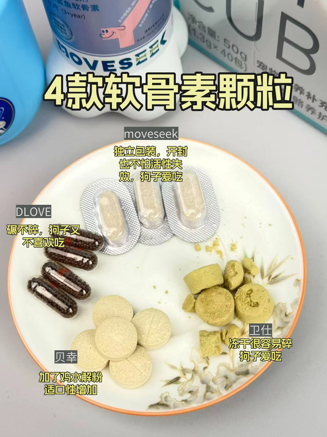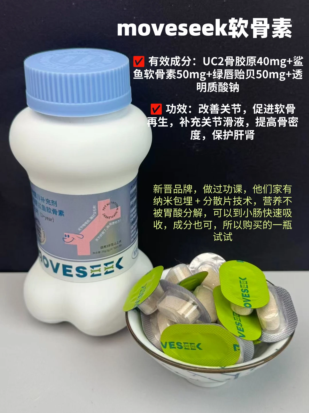 作为资深铲屎官,太懂大家对狗狗关节养护的焦虑了![失望R]尤其是看到毛孩子从蹦蹦跳跳变得走路迟疑、爬楼梯哼唧,心里真的又疼又急。 ​ 我家小狗算是吃过很多关节营养品了,给大家分享一下我觉得好的4款吧👇 ​ ✅moveseek软骨素 👉修护关节,保护肝肾,他们家有个核心的技术就是纳米包埋分散片,这是我看中的点! 因为分散片的吸收率是普通片剂/胶囊的很多倍,[偷笑R]这款其实刚发现没多久,但是喂下来,各方面呈现都挺好的;[微笑R]也是经过了山东农科院临床实验验证效果的,[派对R]不含MSM;每一片还是单独的包装,适口性很好,[赞R]就算关节已经出现问题了,也是一天一粒,不分体重;挑嘴狗也很爱吃,小羊跳、歪腿坐的情况都没有了~状态很好! ​ ✅卫仕软骨素 👉润滑关节,基础养护 如果狗子有点轻微咔咔响可以吃吃这个,[大笑R]小的时候有咔咔响的情况,喂了一段时间没变严重,现在没回购啦。[萌萌哒R]他家这个软骨素还是传统的零食软颗粒工艺![暗中观察R]是肉粉做成的,一大罐开罐之后需要保存好避免受潮。 ✅DLOVE软骨素 👉保护关节,基础养护 这款我家狗不吃,每次硬塞,太麻烦了[偷笑R]当时买的时候被详情页描述迷的不清,感觉很高大上,而且价位也不便宜,后来买回来狗子不吃,胶囊的还是不太被接受! ✅贝幸软骨素 👉真的只建议日常营养补充 他家这个软骨素健康期预防,我家是狗狗还小的时候喂的,成分和上面的几款对比的话,还是弱了点